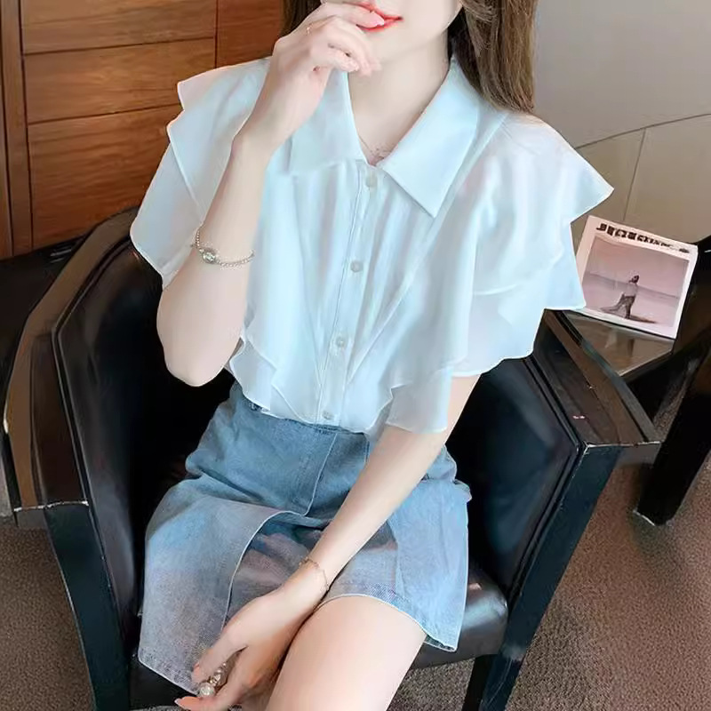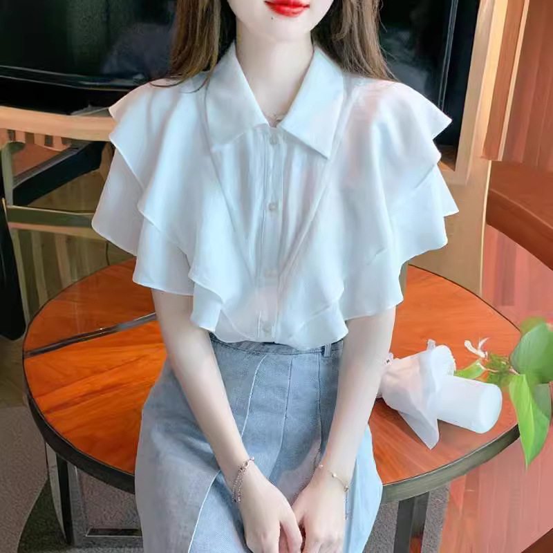 2025年新款洋气气质白色短袖雪纺衬衫女夏装荷叶边上衣时尚洋气女