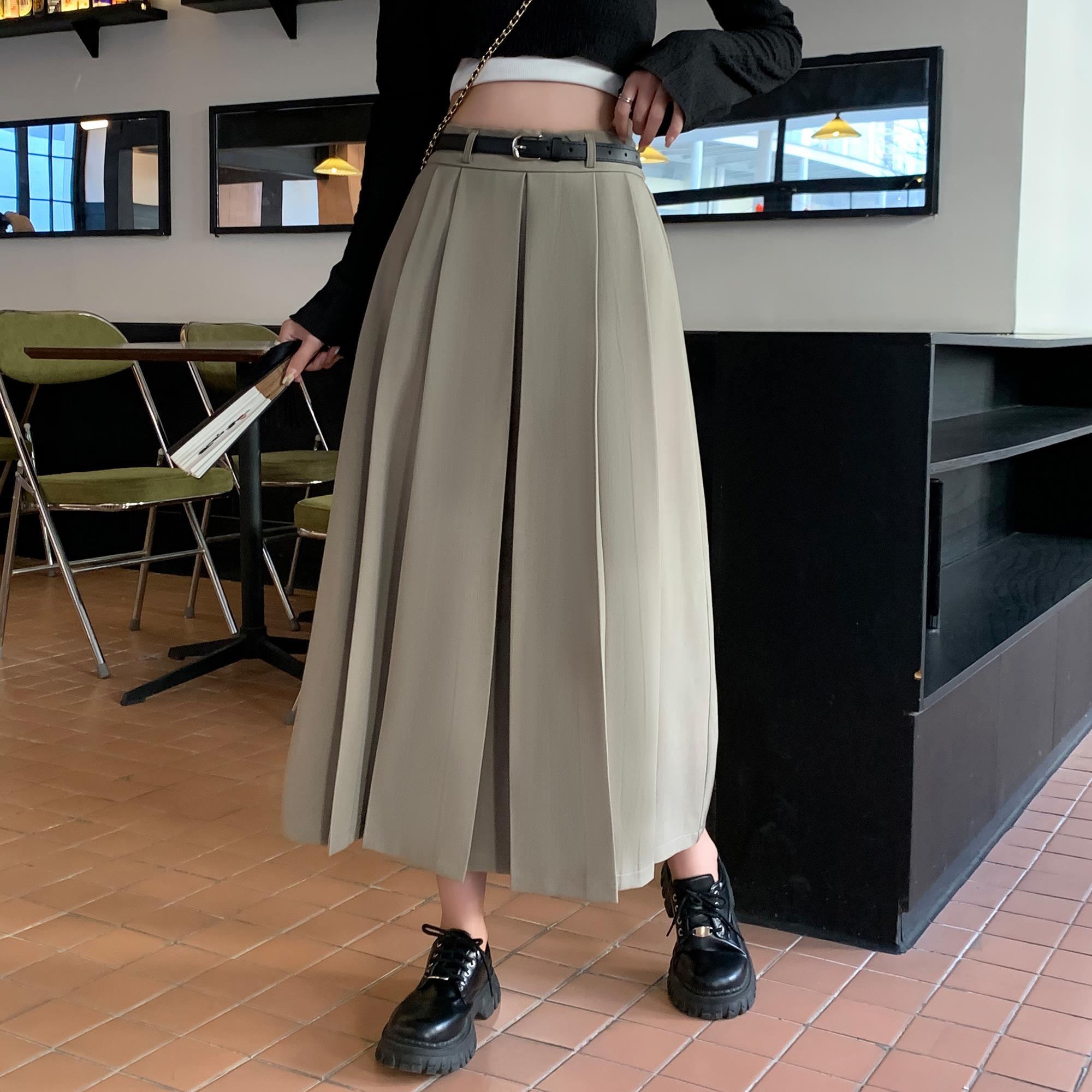 小吉家大码女装学院风高腰百褶西装裙女黑色显瘦遮胯百搭A字裙子
