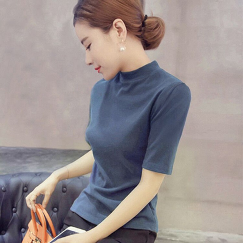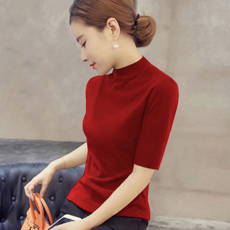 2023秋冬半高领中袖打底衫毛衣女内搭针织衫修身百搭五分袖上衣潮