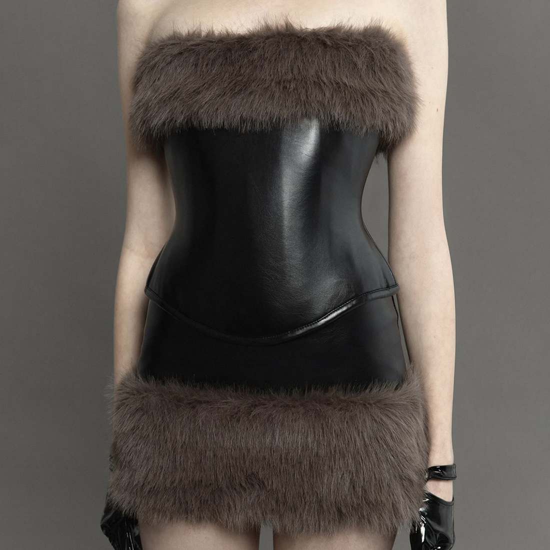 毛茸茸拼接pu皮抹胸超短半裙套装