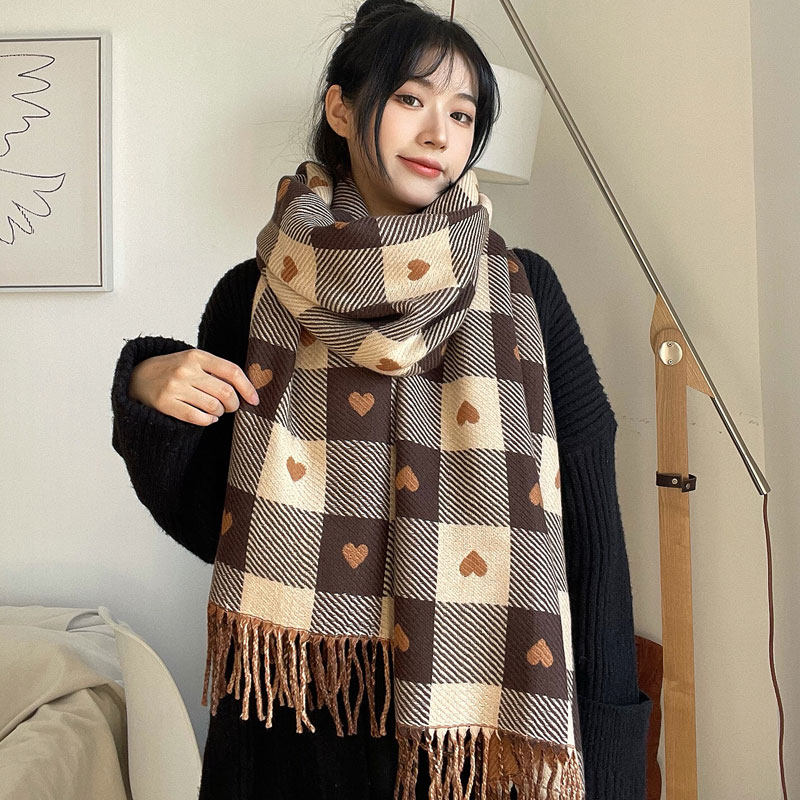 高级感百搭爱心格子围巾女冬韩版学生保暖防寒仿羊绒毛线护颈围脖