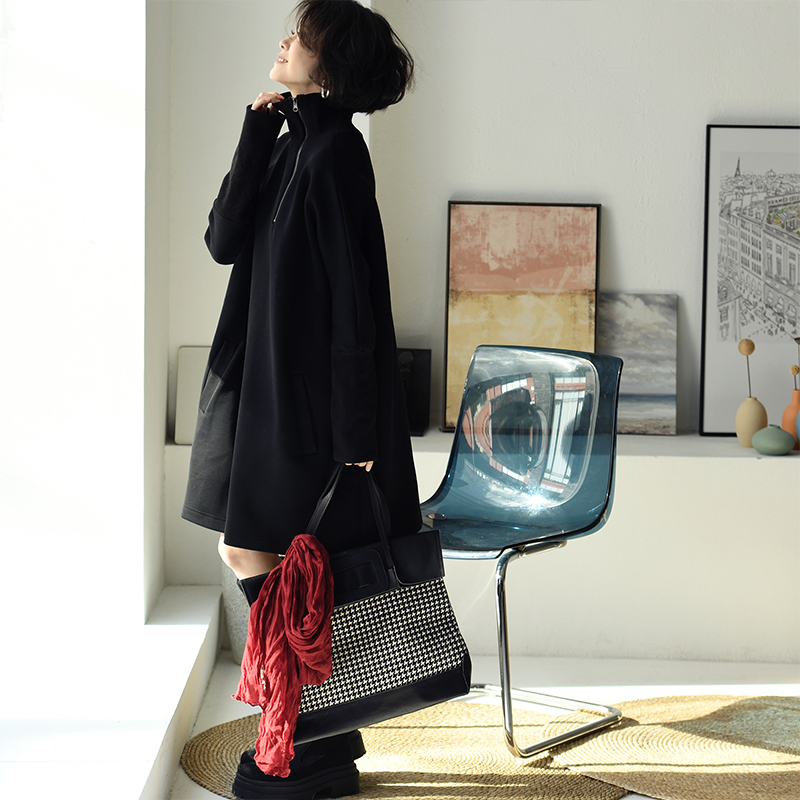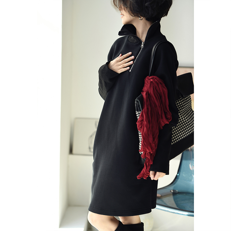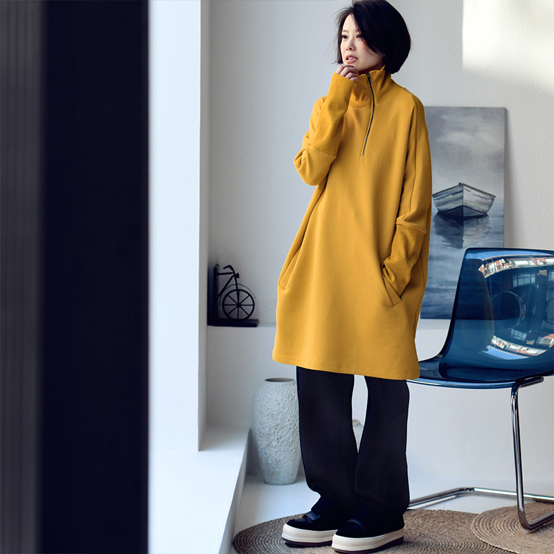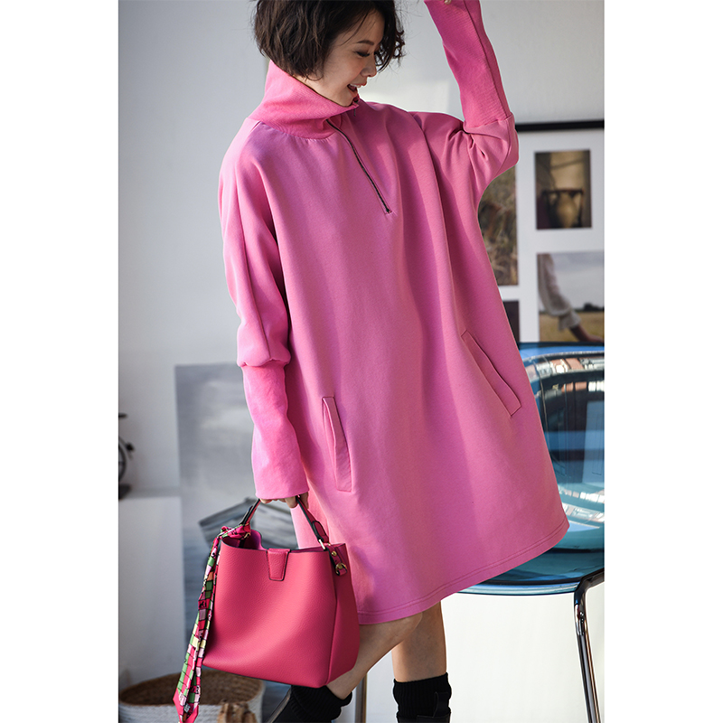 Q2917C气质休闲简约半拉链宽松中长款高领卫衣连衣裙女冬米兰宣言