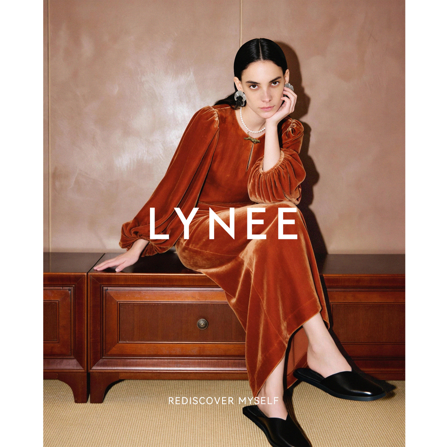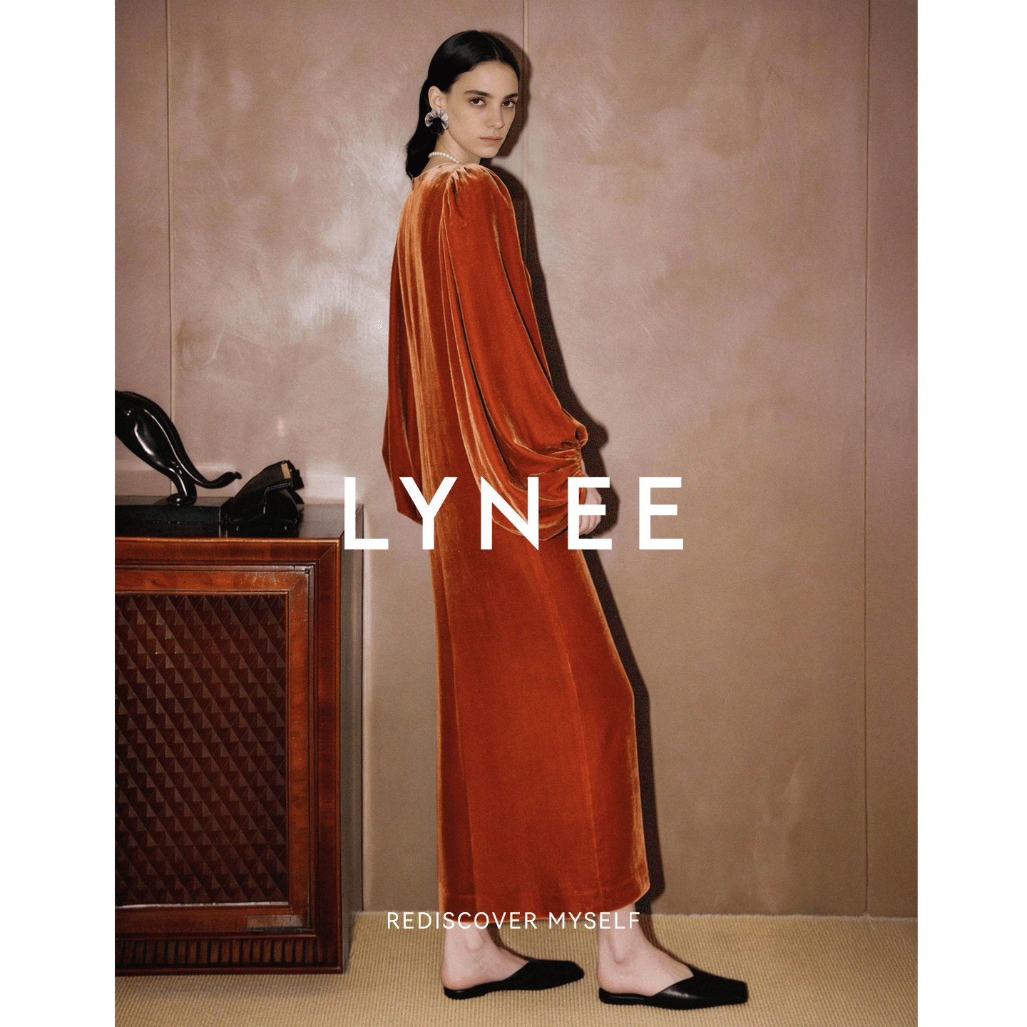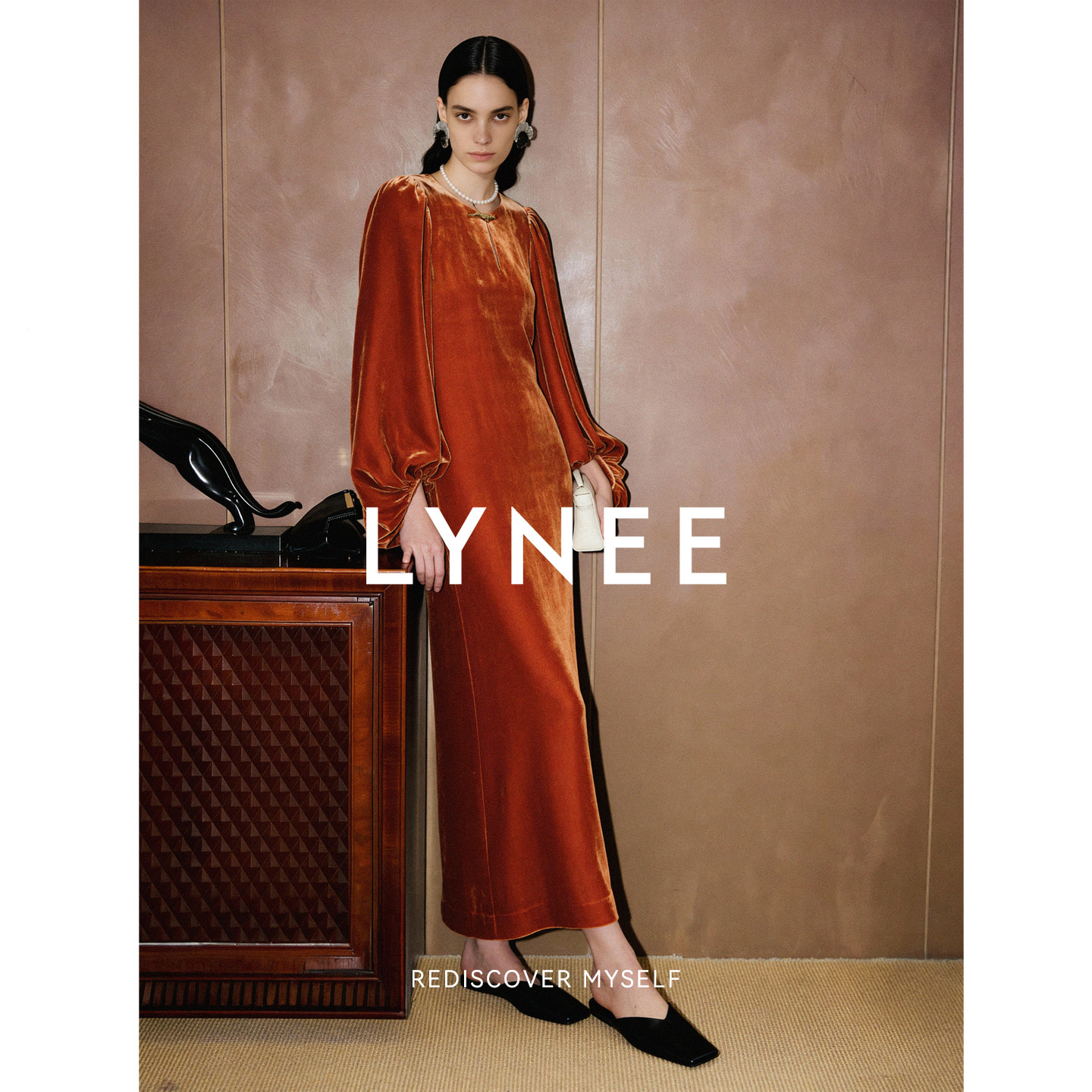 LYNEE x TORIL【黑标 暮色鎏光】华丽橙色灯笼袖真丝丝绒连衣裙