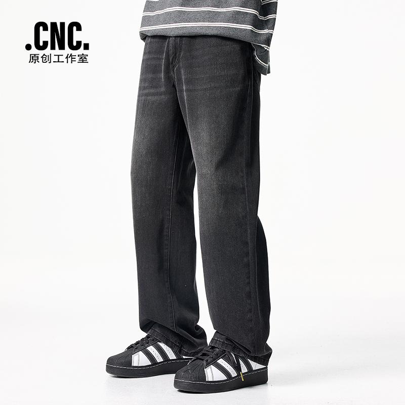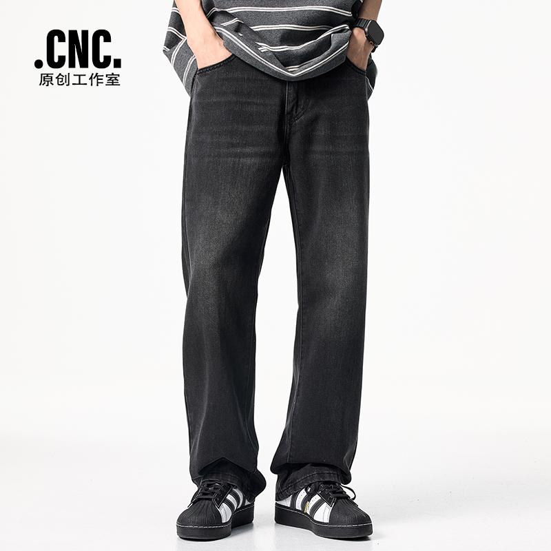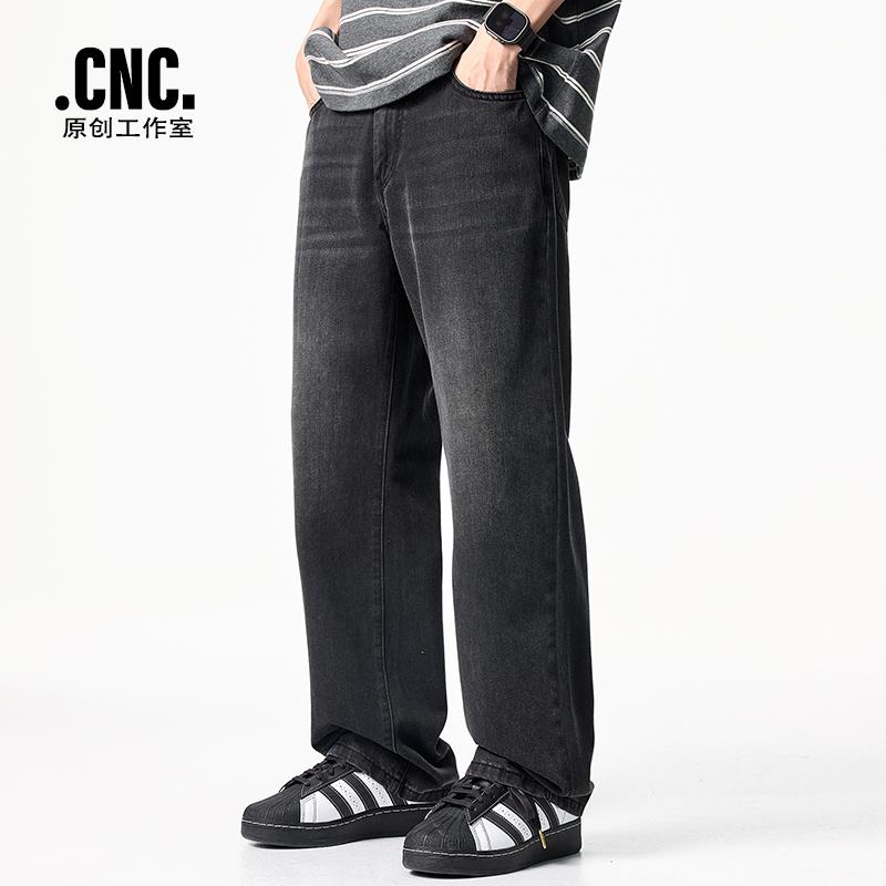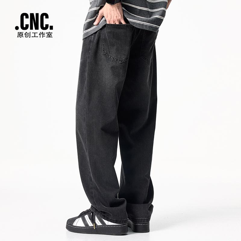 CNC美式复古显高水洗猫须牛仔裤男秋冬款加绒加厚宽松直筒阔腿裤