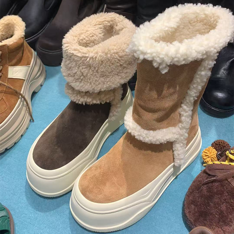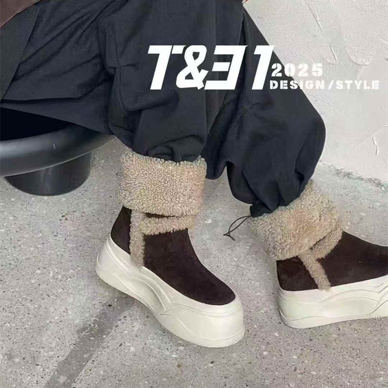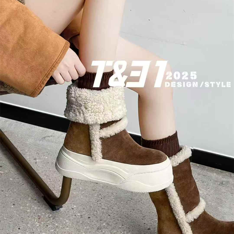 T31女鞋2025冬季新款欧货中短筒皮毛一体雪地棉磨砂皮两穿雪地靴