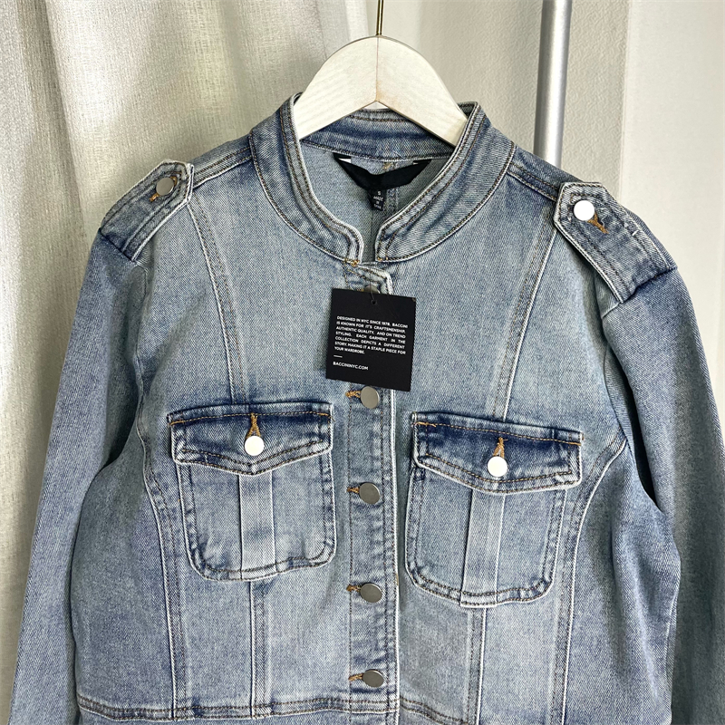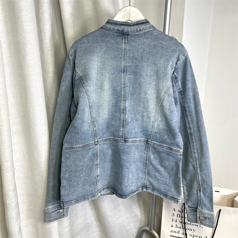 美式~通勤多口袋夹克!复古水洗浅蓝色简约无领修身牛仔外套女
