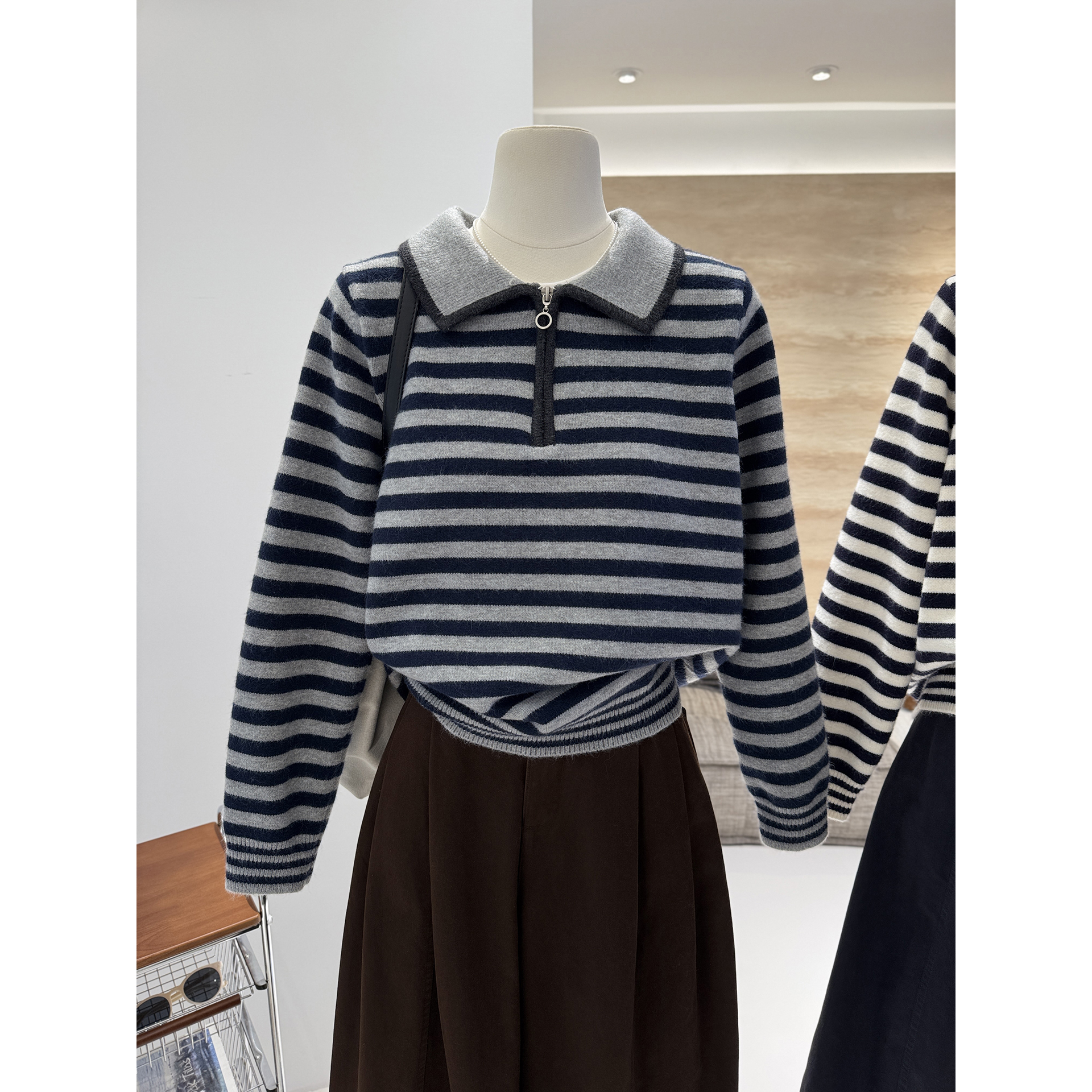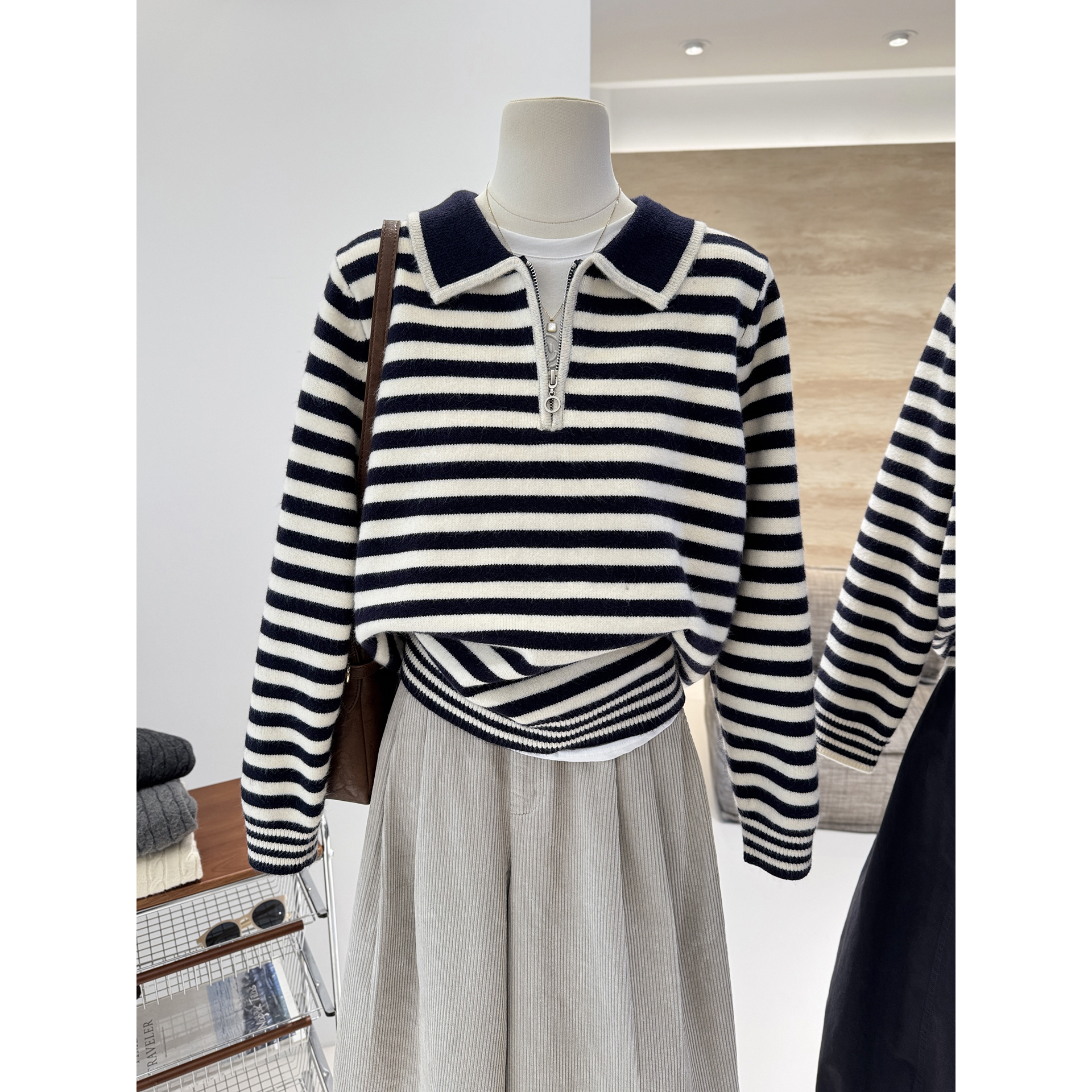秋冬韩版百搭宽松显瘦半拉链Polo领条纹针织衫女翻领长袖毛衣上衣