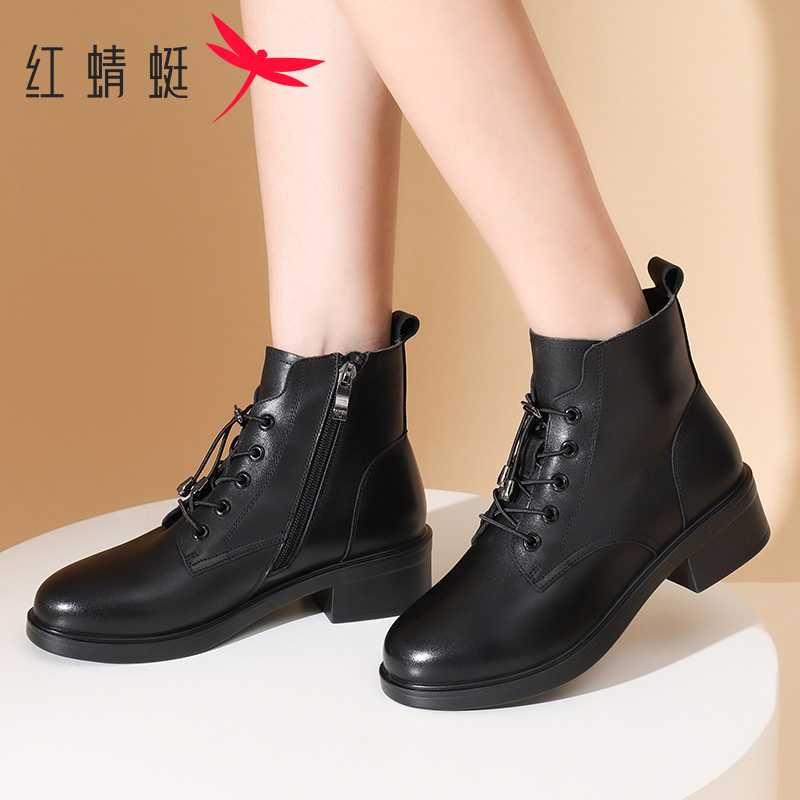 红蜻蜓女鞋2025秋冬真皮时尚短靴休闲舒适加绒保暖英伦风马丁靴