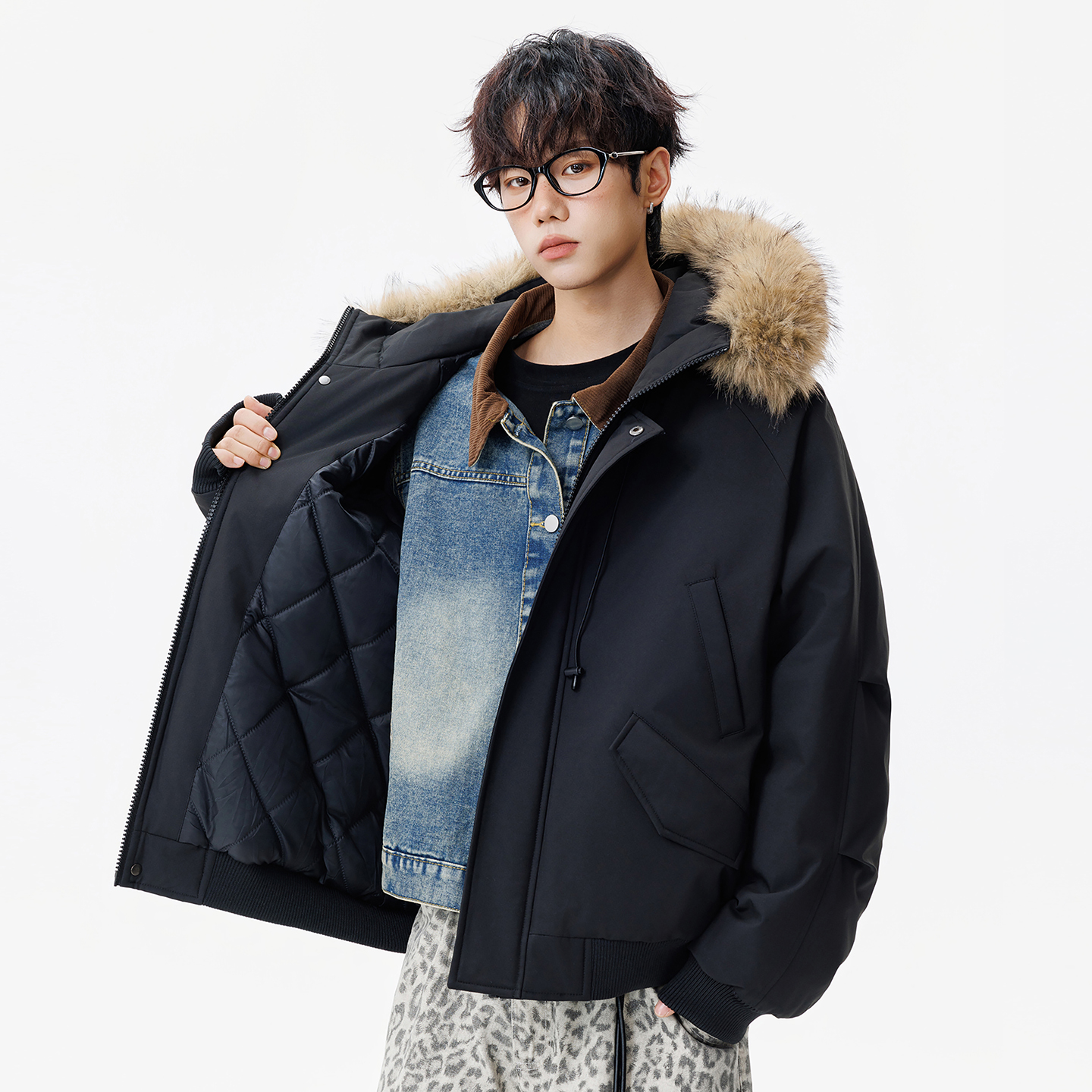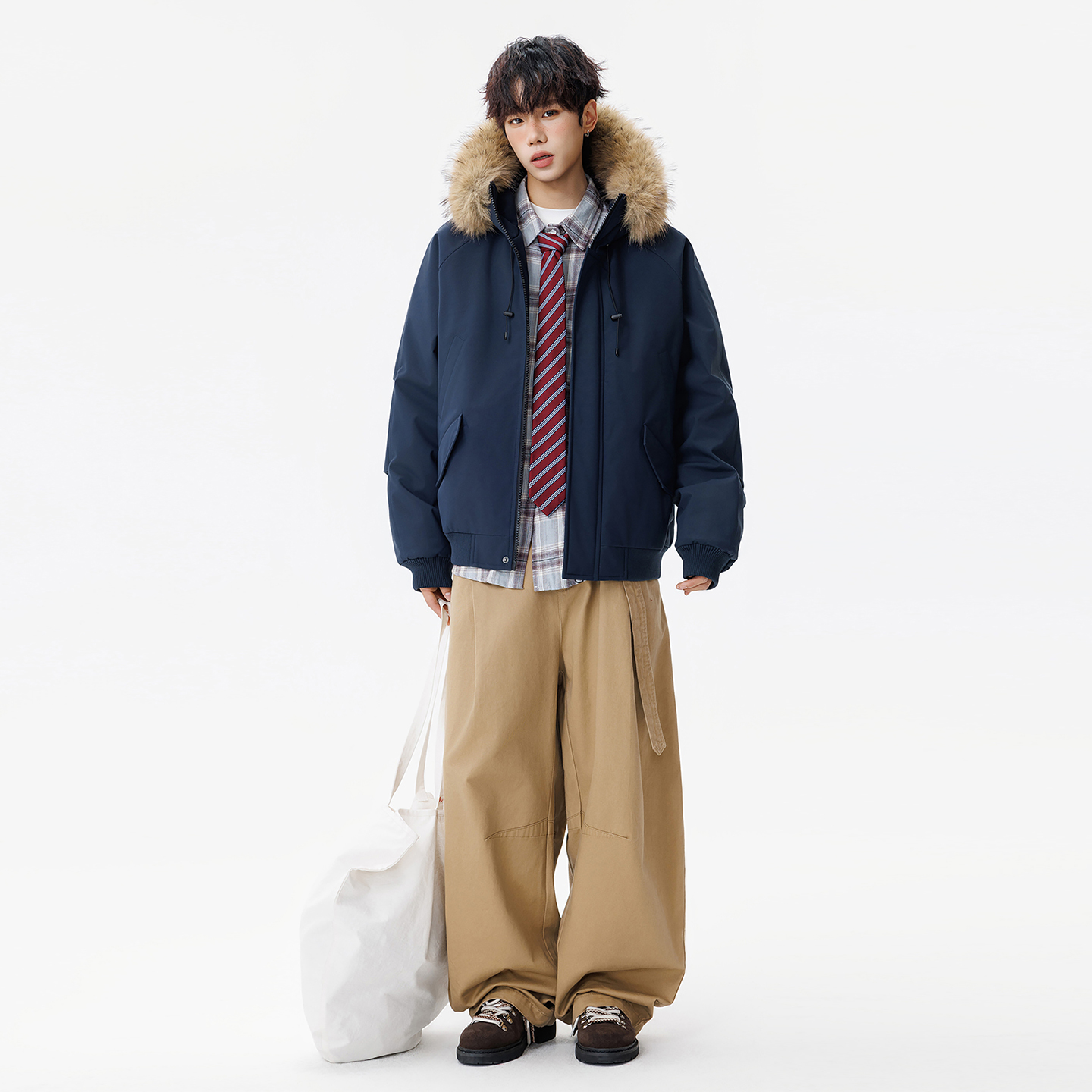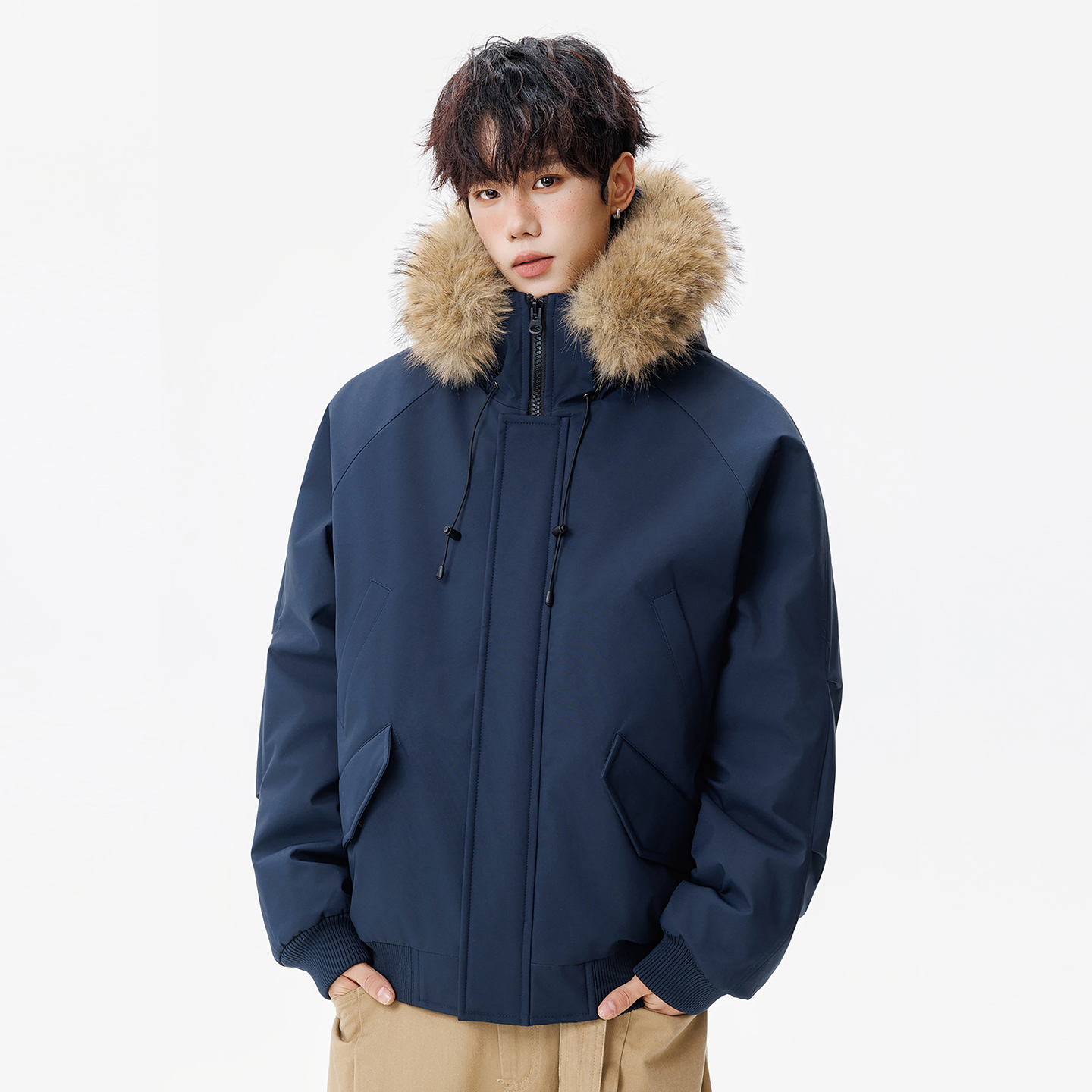 迈特优藏青色短款派克棉服男女冬季保暖加厚防风毛领情侣棉衣外套