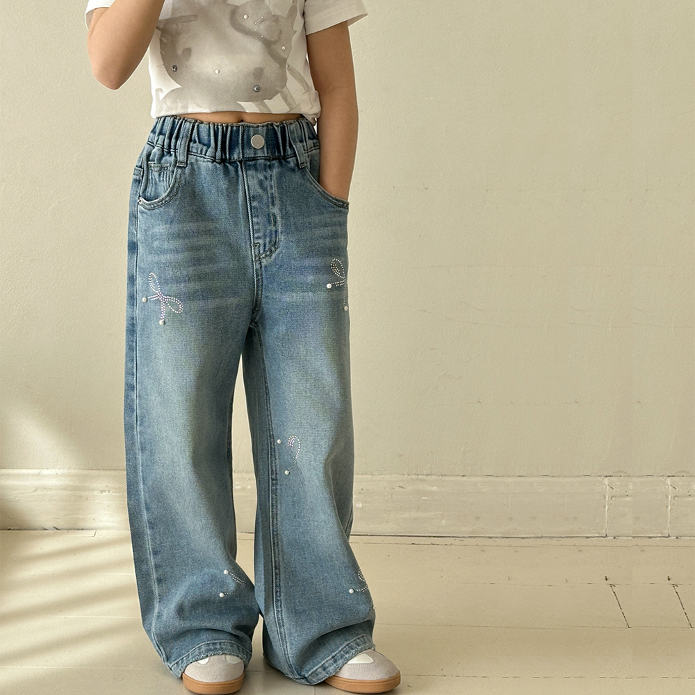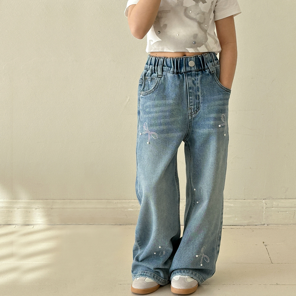 女童牛仔裤春秋款2025新款儿童秋季水钻蝴蝶结直筒裤宽松阔腿裤子