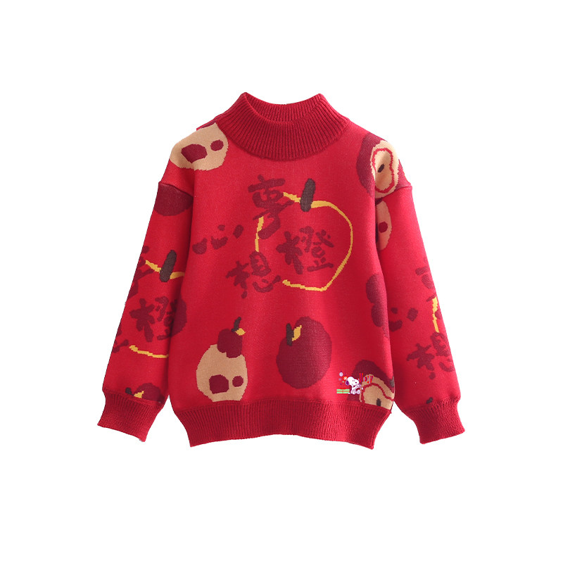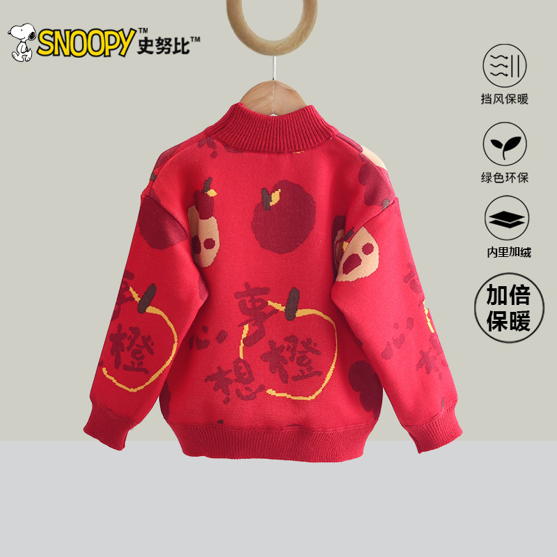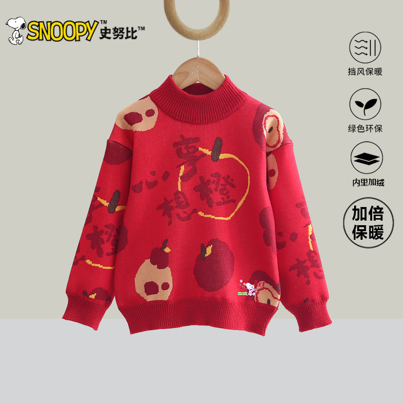 史努比女童红色毛衣2025新款儿童冬季加厚拜年服男孩喜庆过年上衣