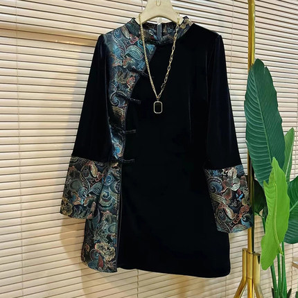 法式大码女装圆领盘扣拼接撞色长袖复古风时尚秋冬款显瘦百搭上衣