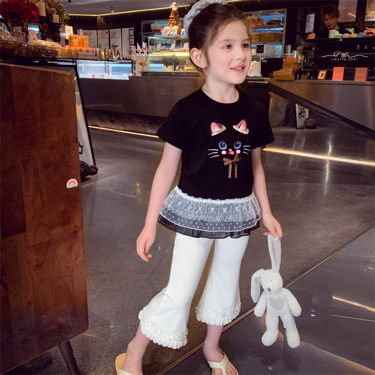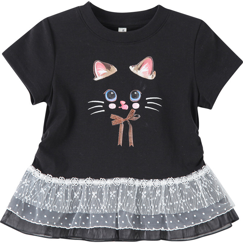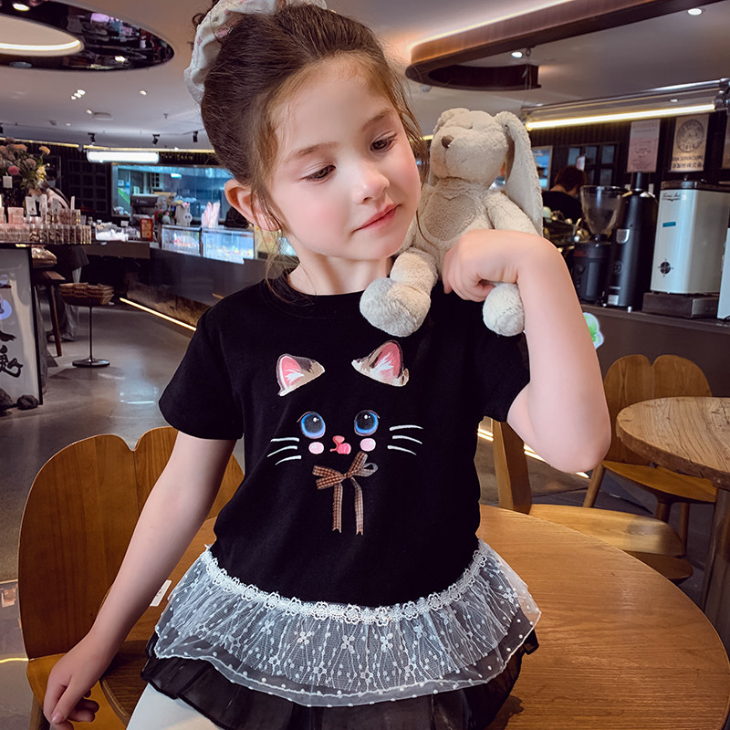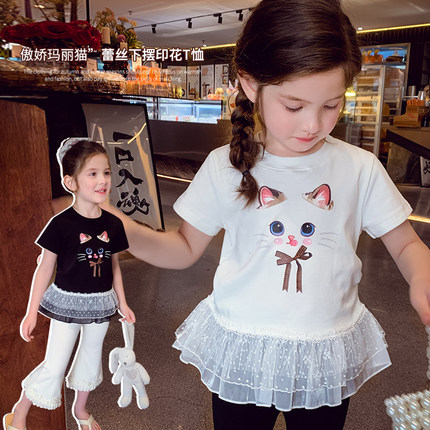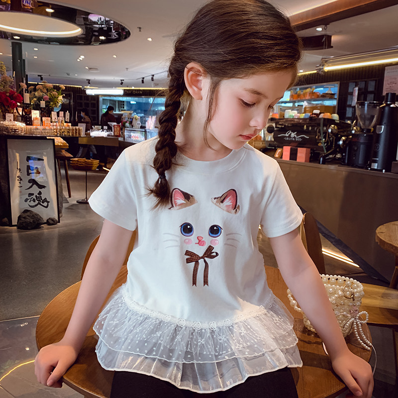 女童卡通印花T恤夏装2025新款时髦儿童拼接蕾丝短袖上衣女孩打底
