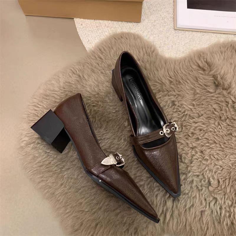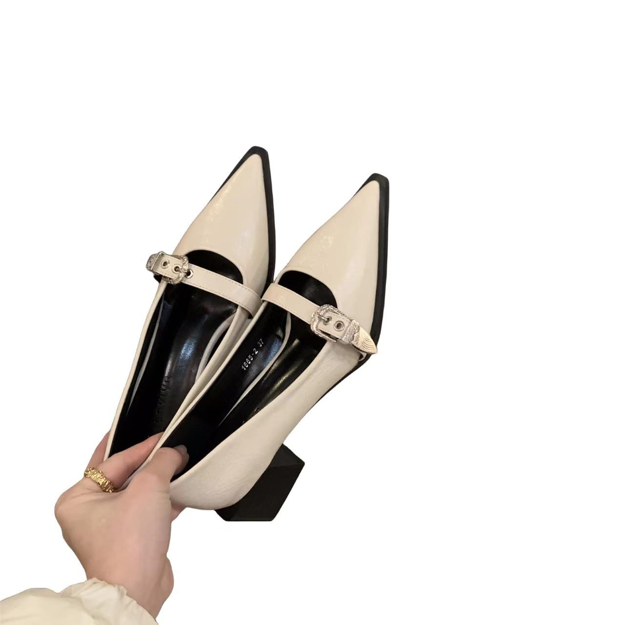 新款大码高跟鞋年新款欧美风尖头百搭一字扣带浅口粗跟单鞋