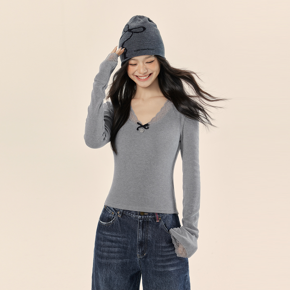 EPTISON针织打底衫女2025冬新款修身少女风V领蕾丝拼接轻熟短上衣