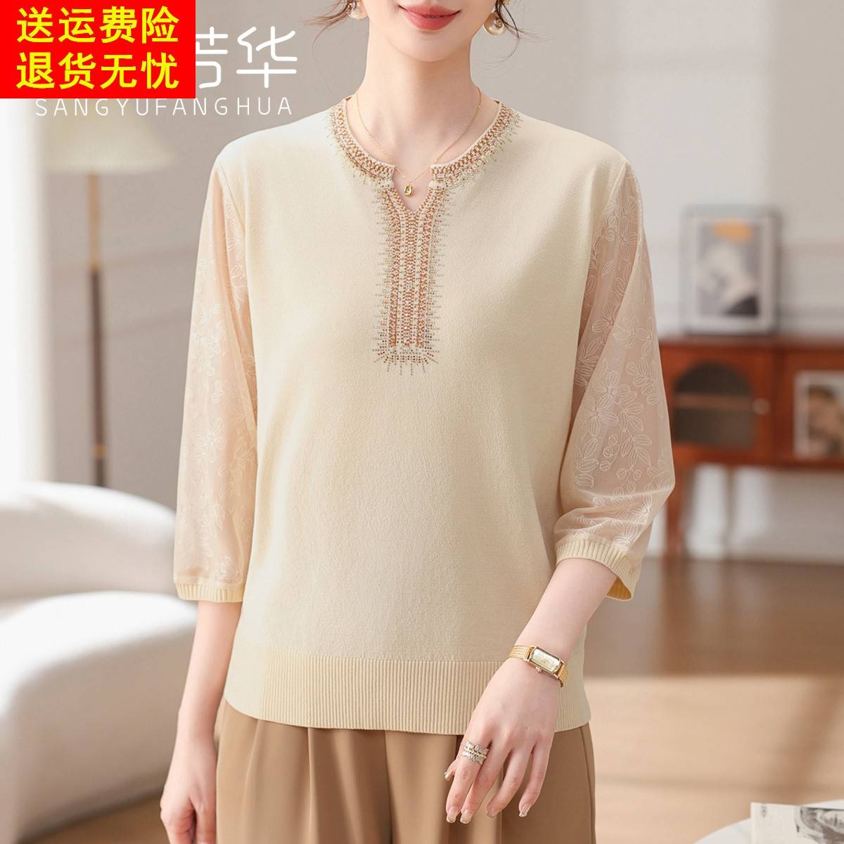 中年妈妈春装针织衫长袖上衣2025新款洋气打底小衫中老年女装T恤