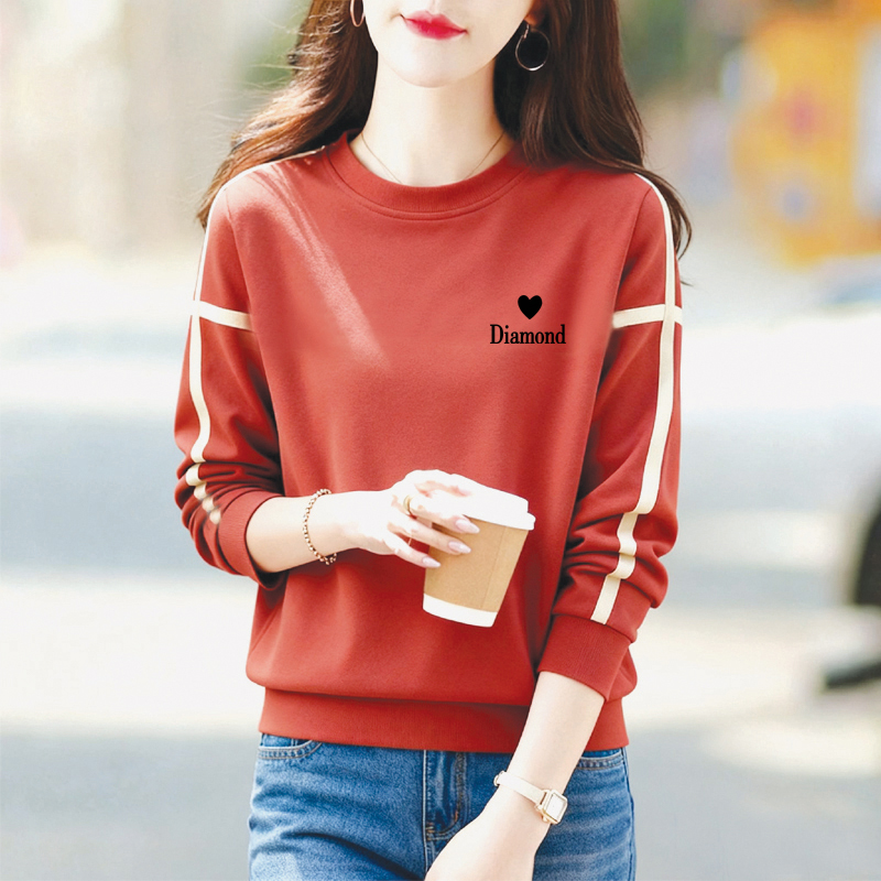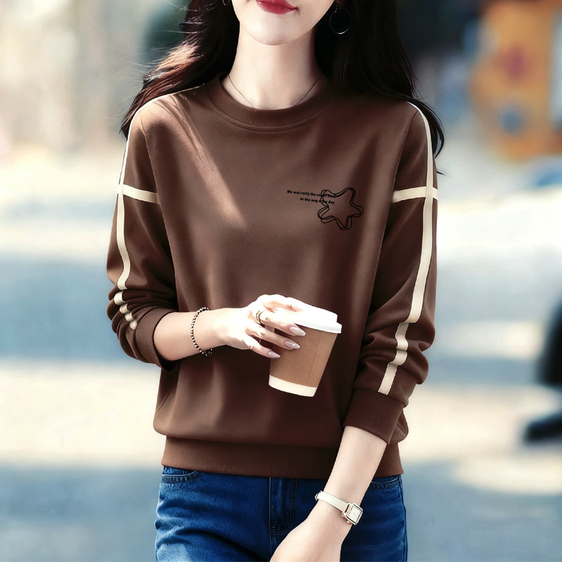 外贸出口女装时尚拼色纯棉印花卫衣女秋冬文艺圆领长袖上衣打底衫