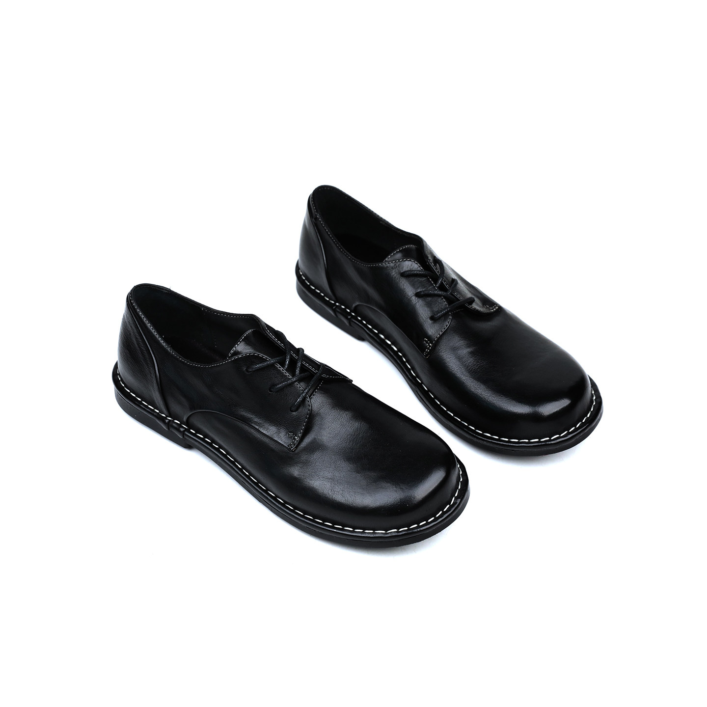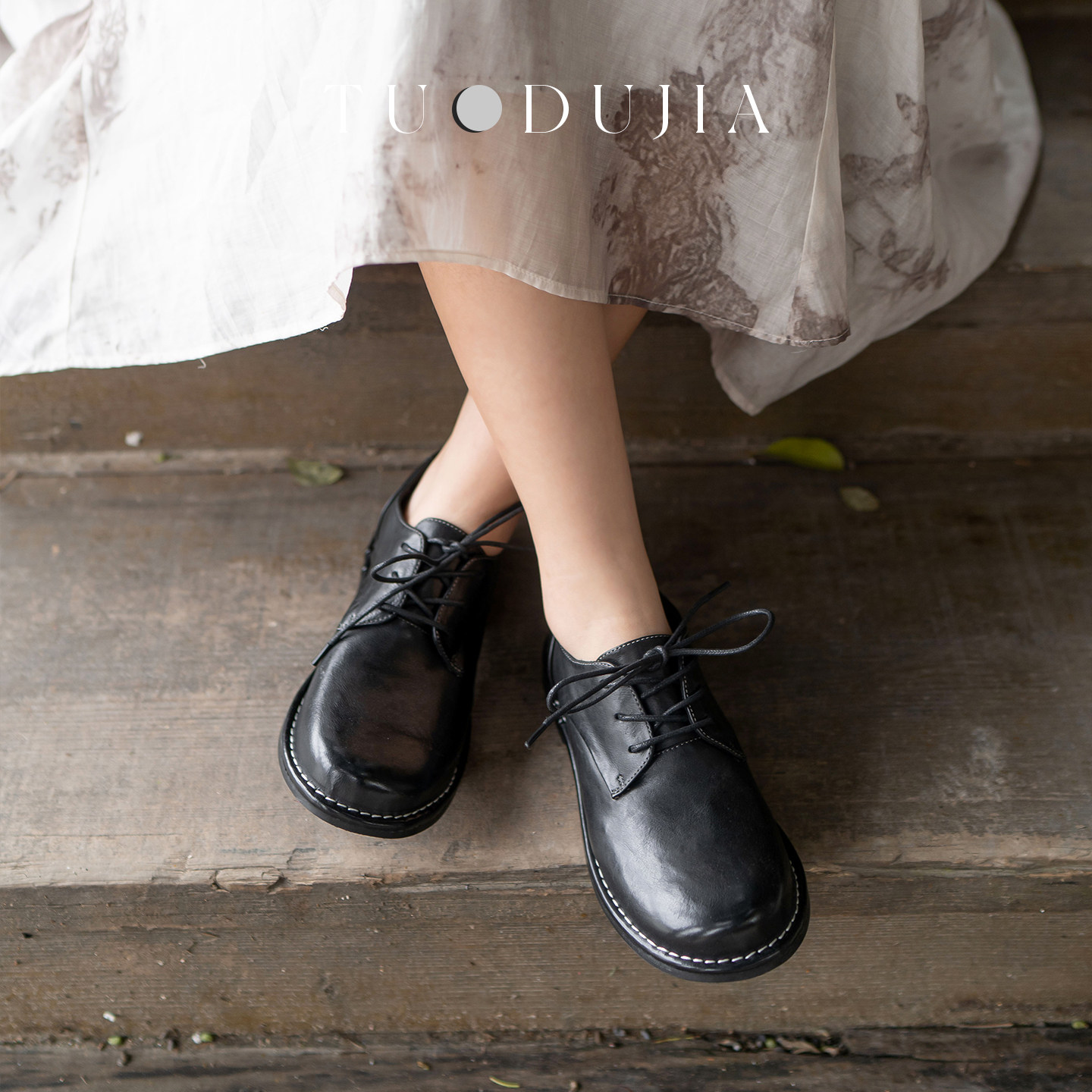 脱毒家2025新款 牛皮英伦风浅口小皮鞋真皮系带平底鞋圆头女单鞋