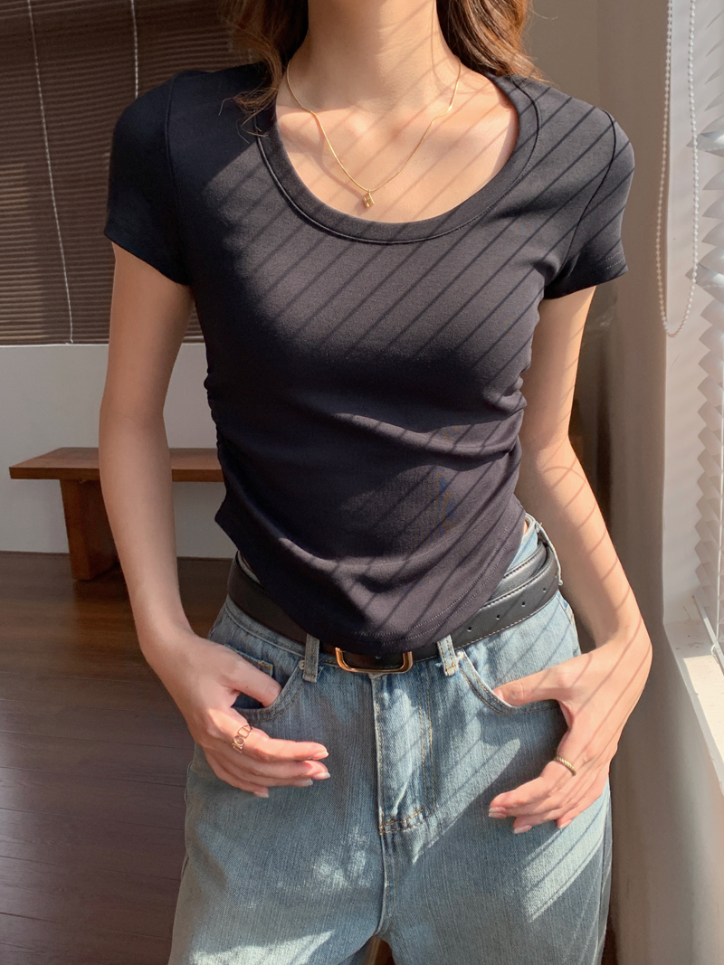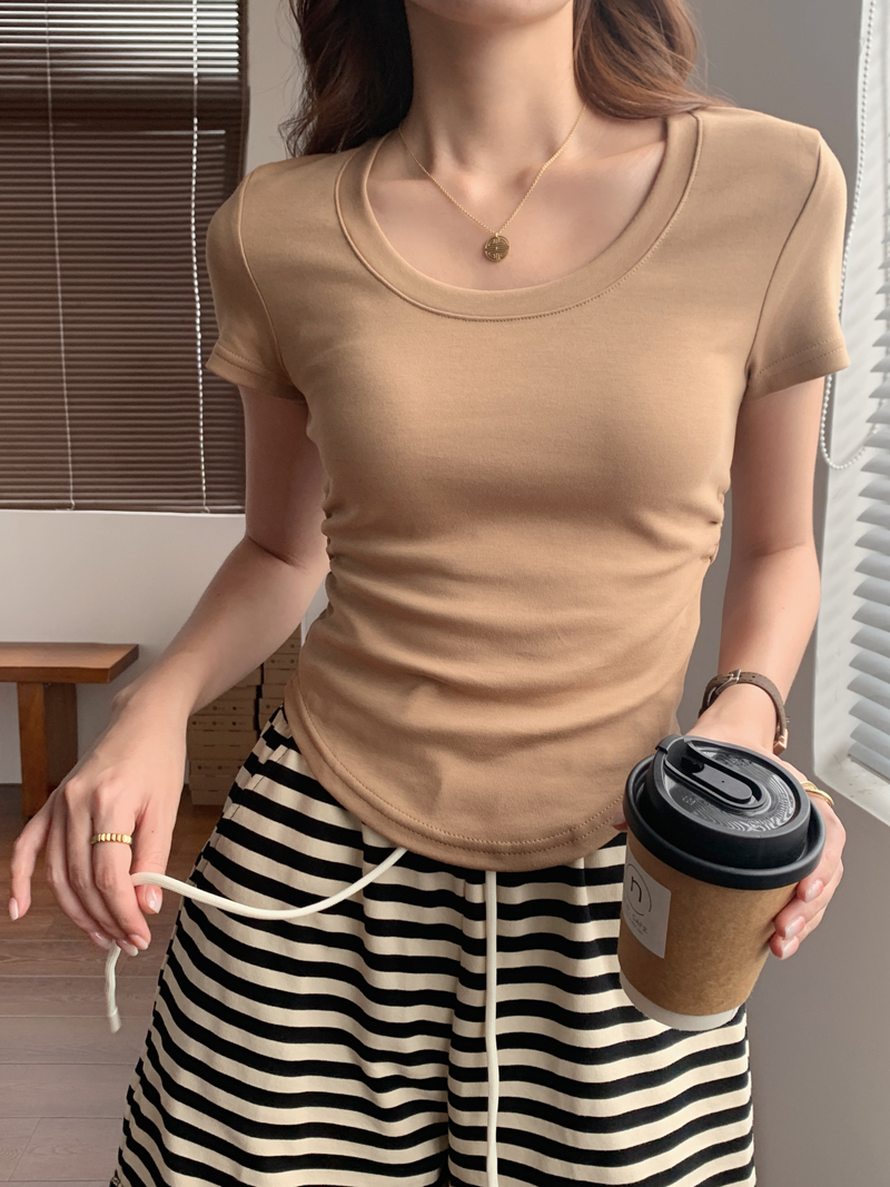 夏季设计感U领短袖t恤女收褶修身打底衫内搭纯色短款卡腰收腰上衣