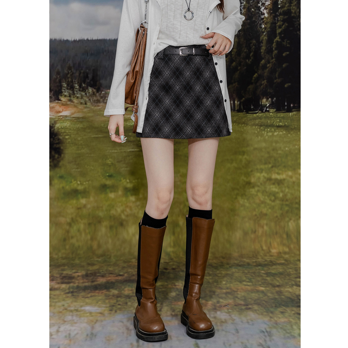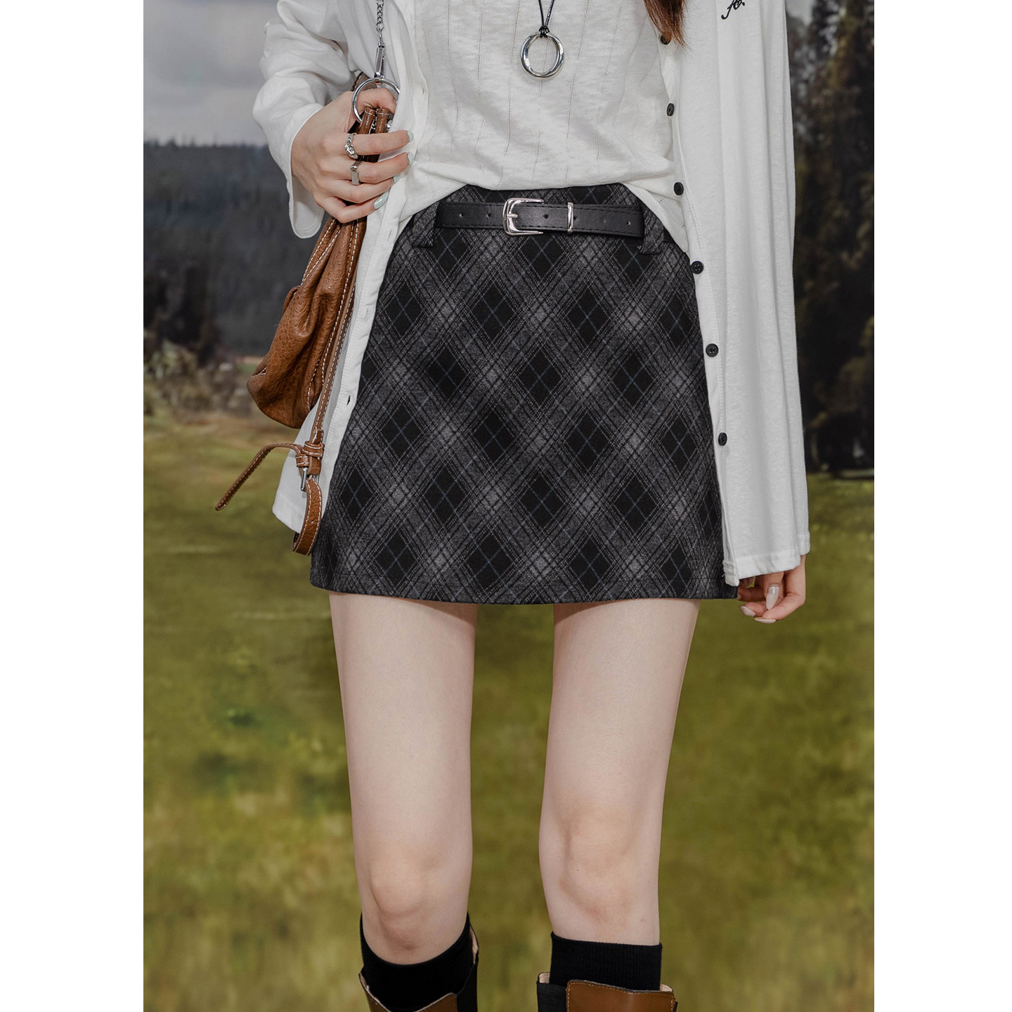 复古毛呢格纹包臀百搭半身裙