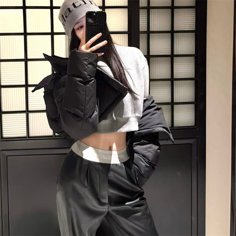 时髦套装女秋冬短款圆领落肩挺括卫衣哑光阔腿裤高腰字母织带皮裤