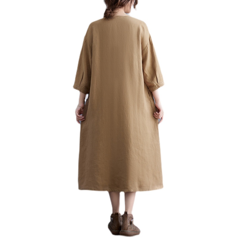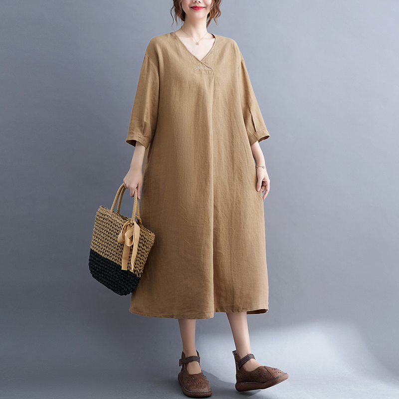 夏新品通勤女装短袖亚麻连衣裙宽松V领麻裙休闲舒适文艺长裙净色