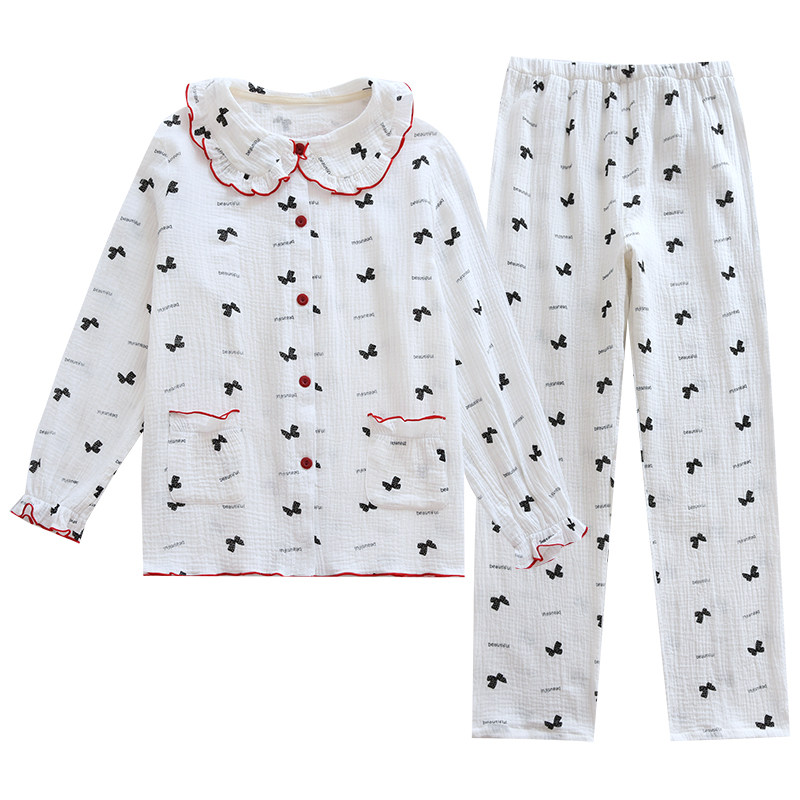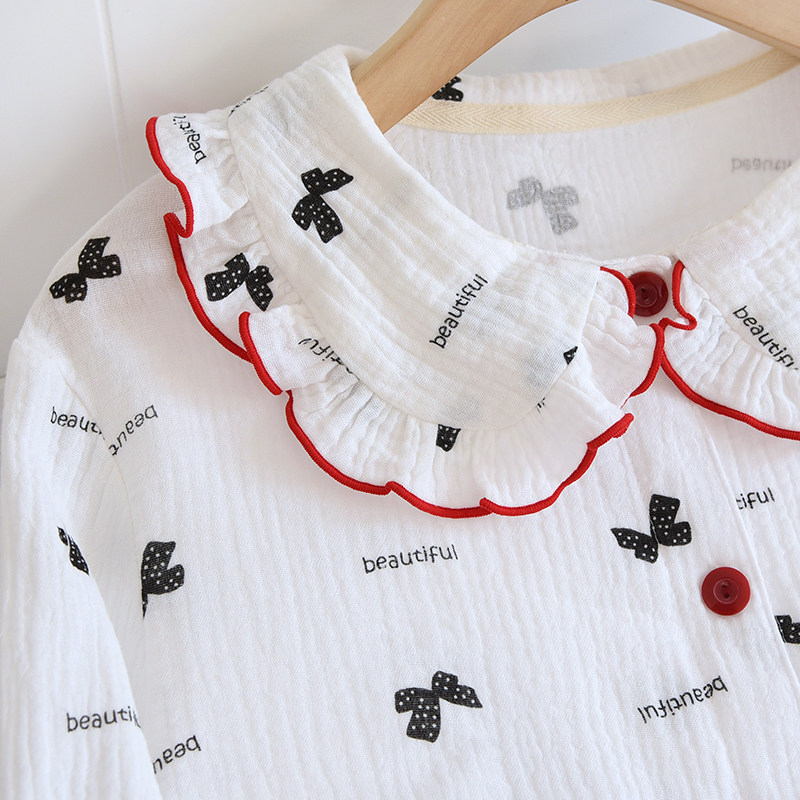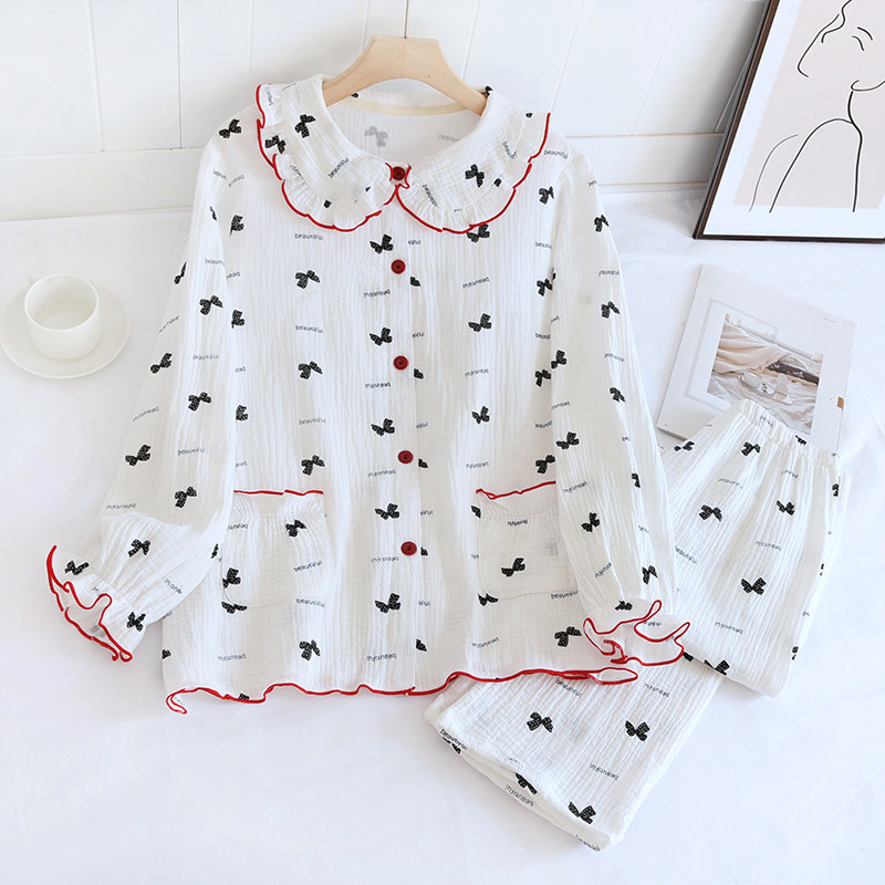 纯棉绉布睡衣女春夏秋全棉双层纱布长袖开衫娃娃领休闲甜美家居服