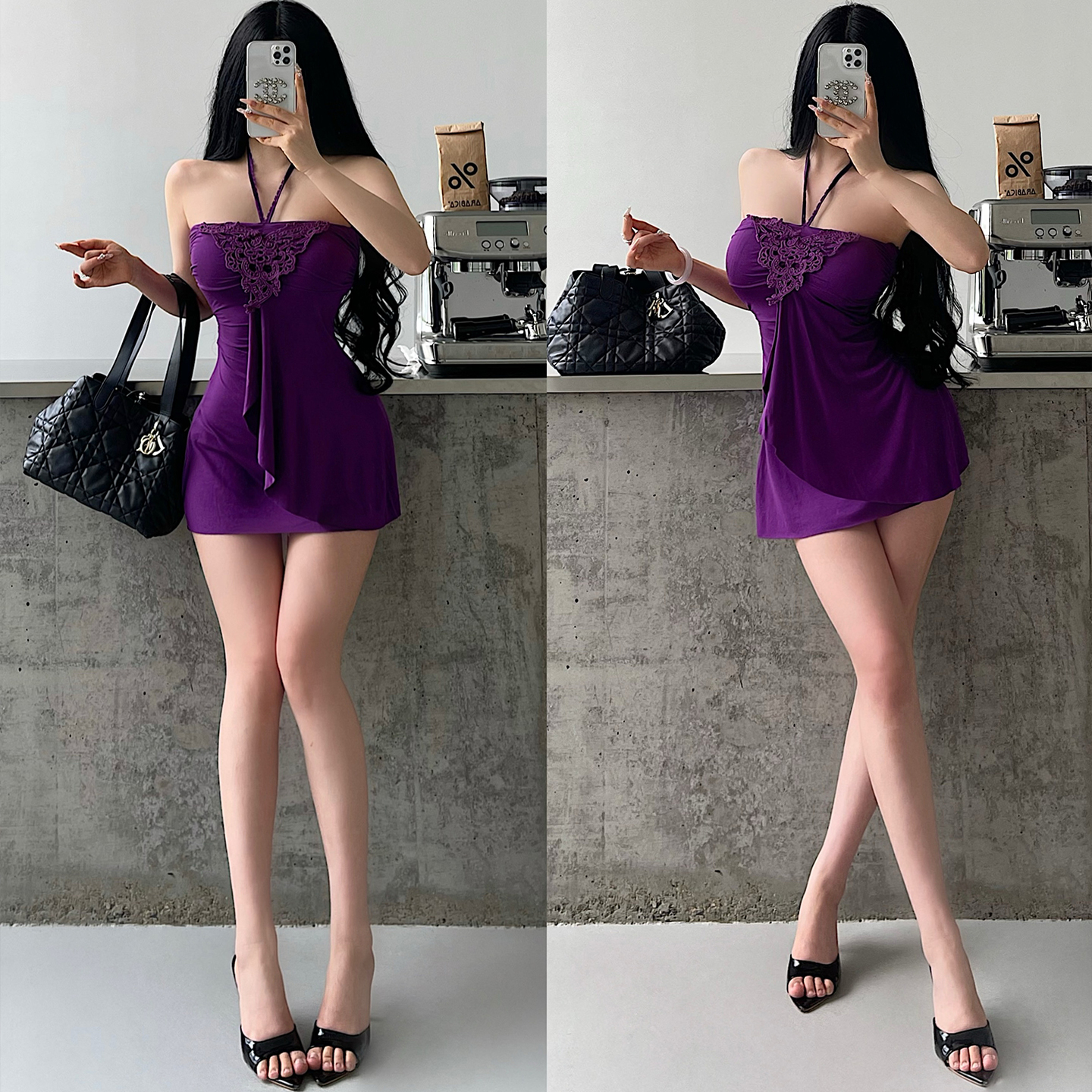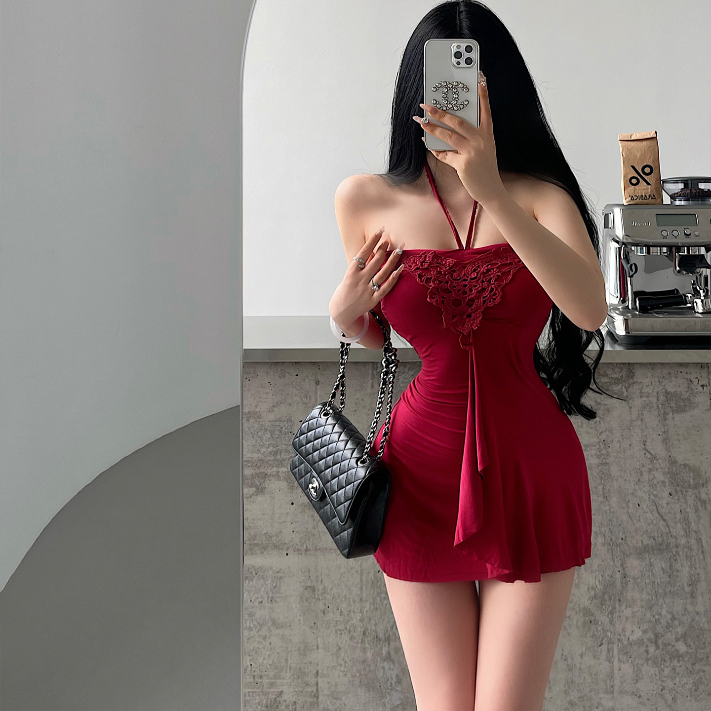 YoungGirlDay纯欲风性感蕾丝拼接褶皱收腰抹胸挂脖连衣裙包臀短裙