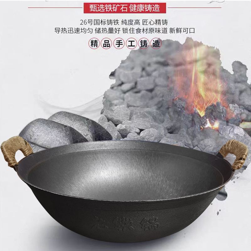 生铁锅双耳传统老式炒锅家用无涂层不粘锅铸铁大铁锅燃气灶用圆底