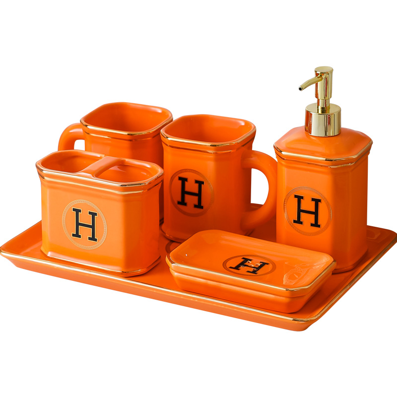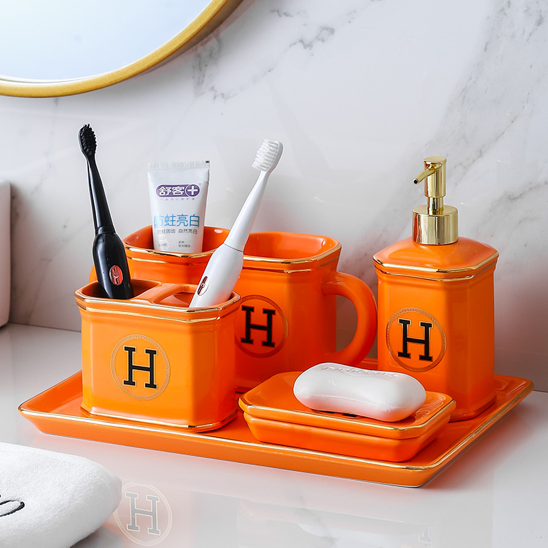 橙色家用一对陶h瓷牙刷杯组合刷牙杯子牙缸情侣洗漱口杯套装带托