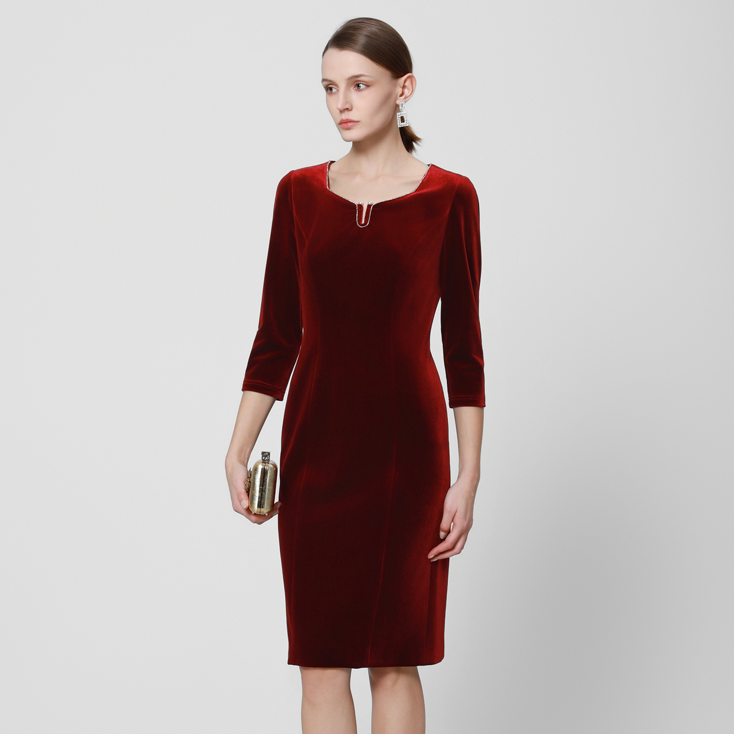 商场同款马天奴2025秋冬新款红色丝绒连衣裙子钻链修身包臀一步裙