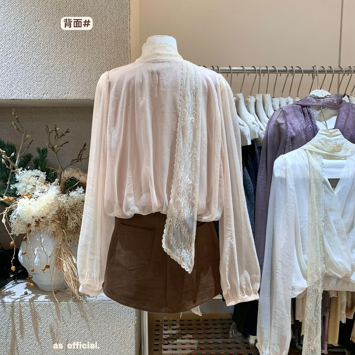 V领蕾丝飘带长袖雪纺衬衫女早秋高级感泡泡袖衬衣法式温柔风上衣