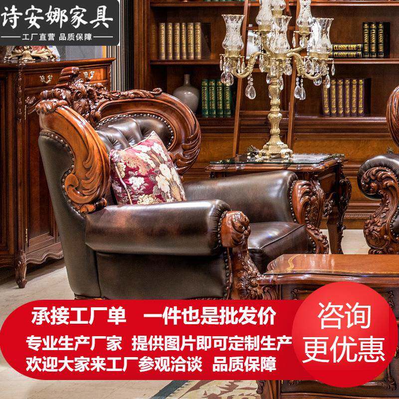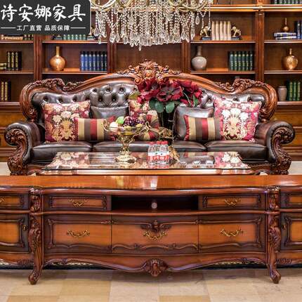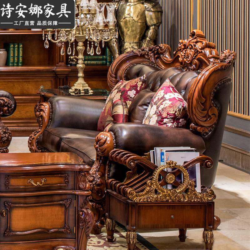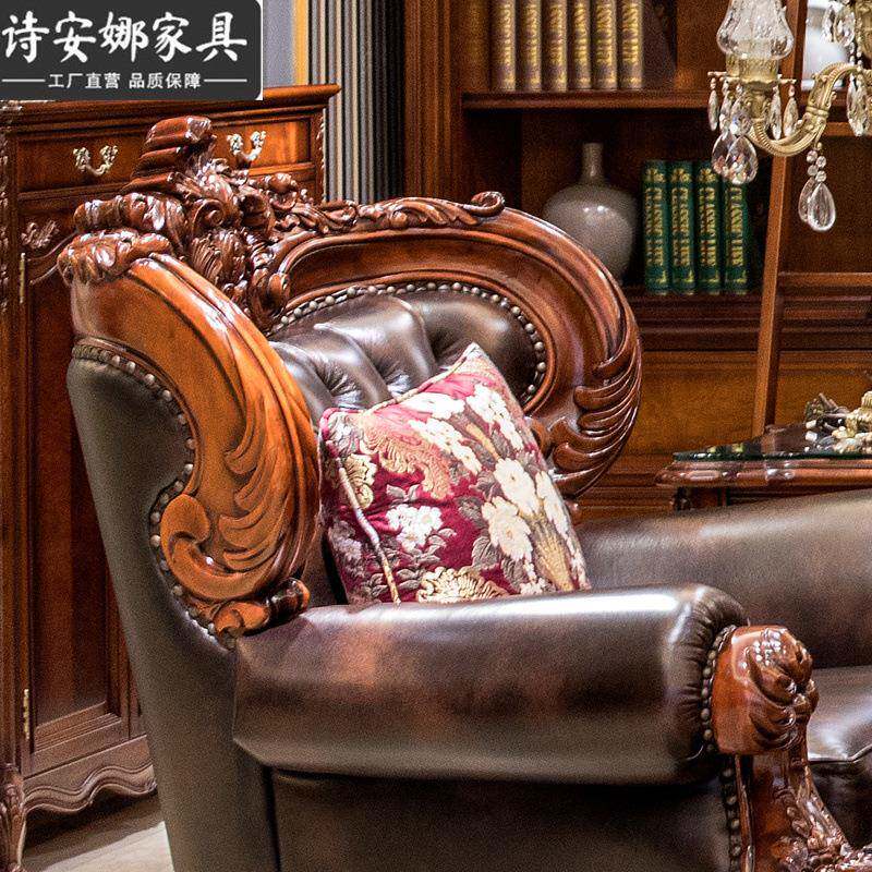 欧式皮艺沙发大户型客厅皮艺实木手工雕花美式沙发123组合