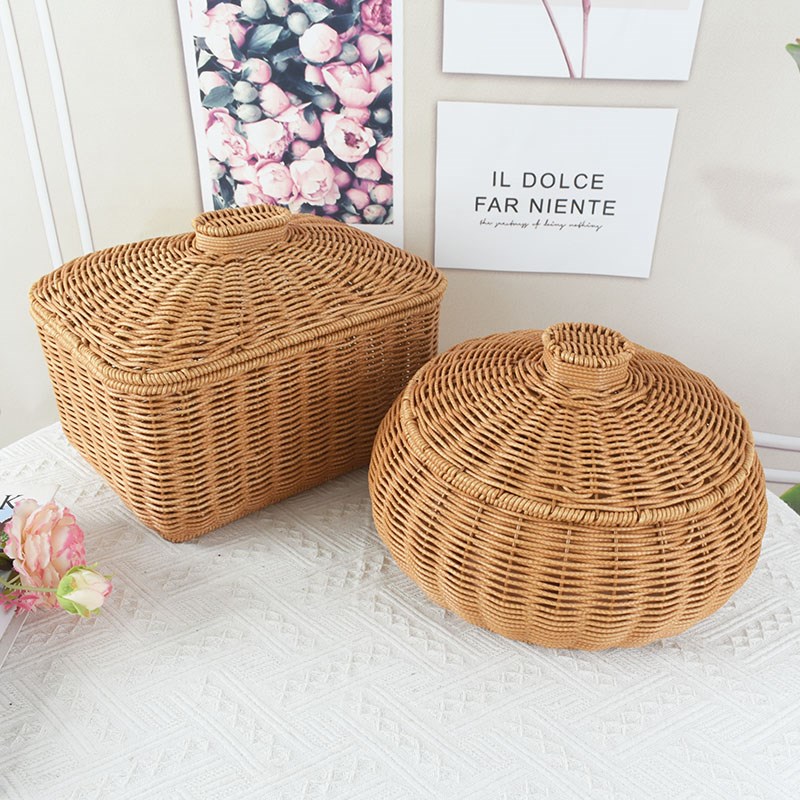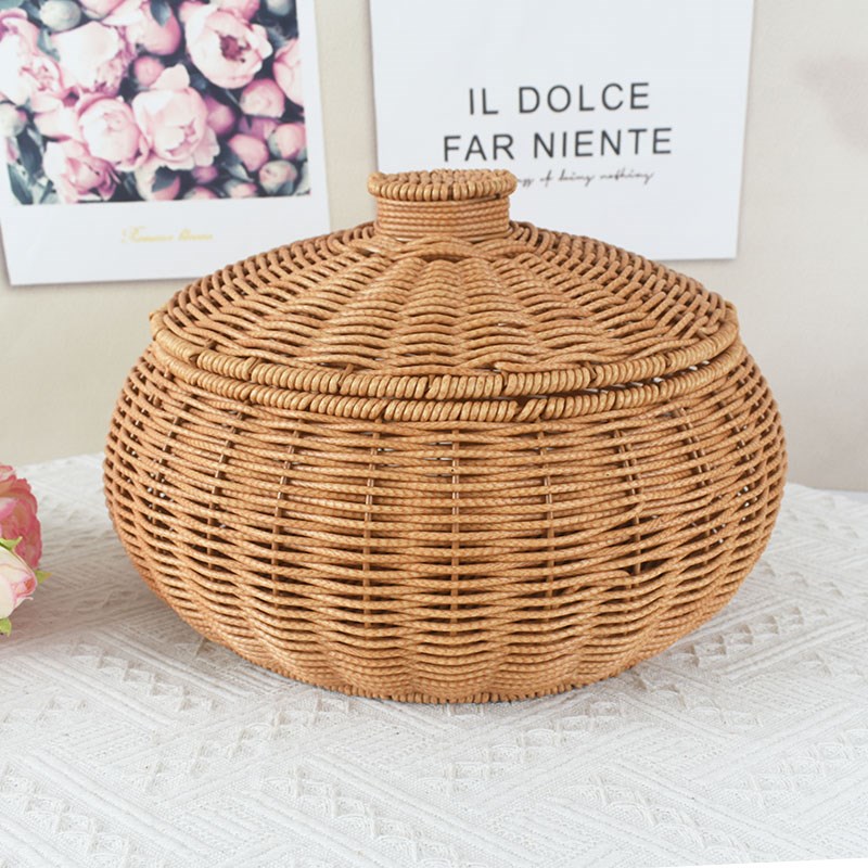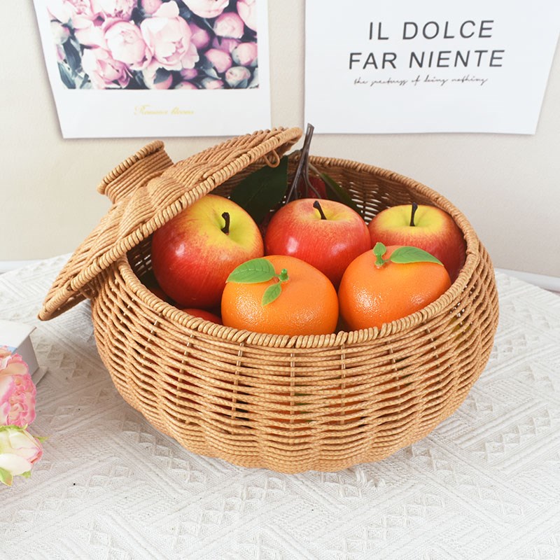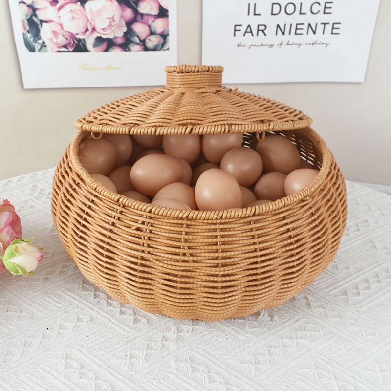 仿藤编织水果篮h带盖圆形零食收纳筐藤编鸡蛋篮储物收纳盒馒头筐