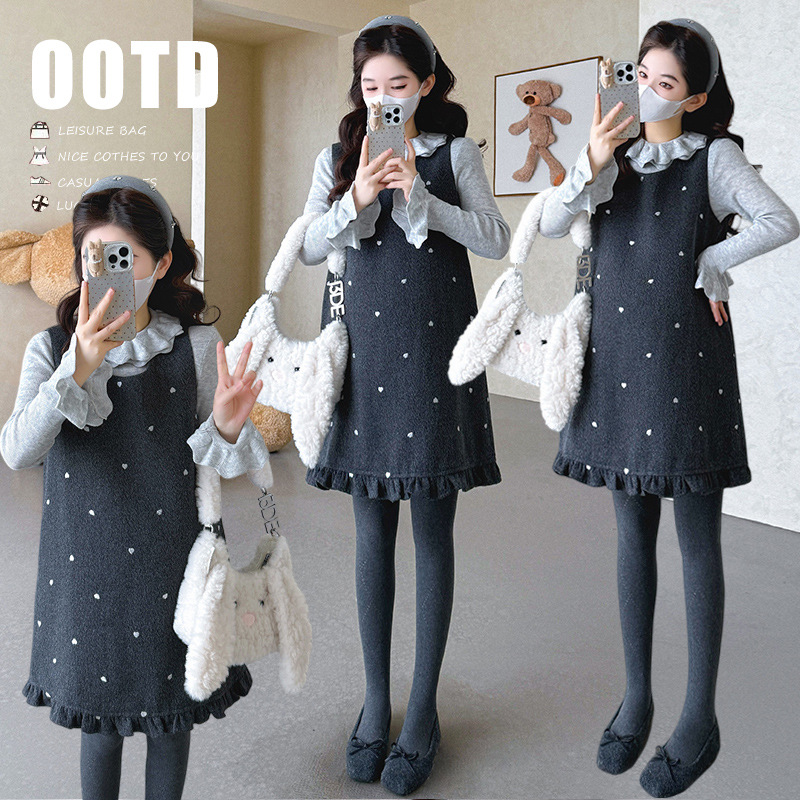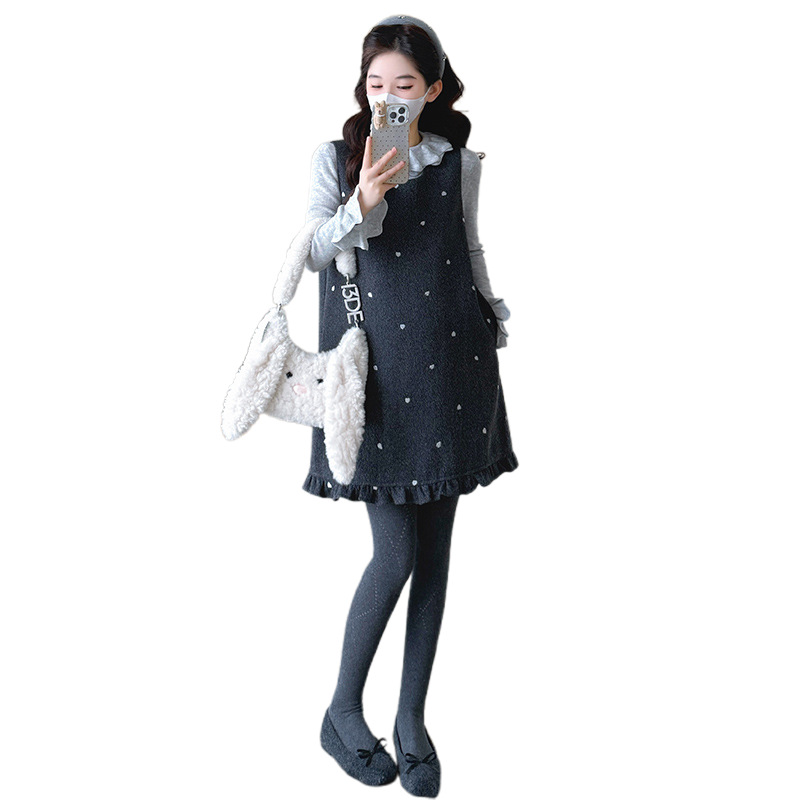 实拍 秋冬新款木耳边下摆毛呢背心裙+蛋糕领打底两件套