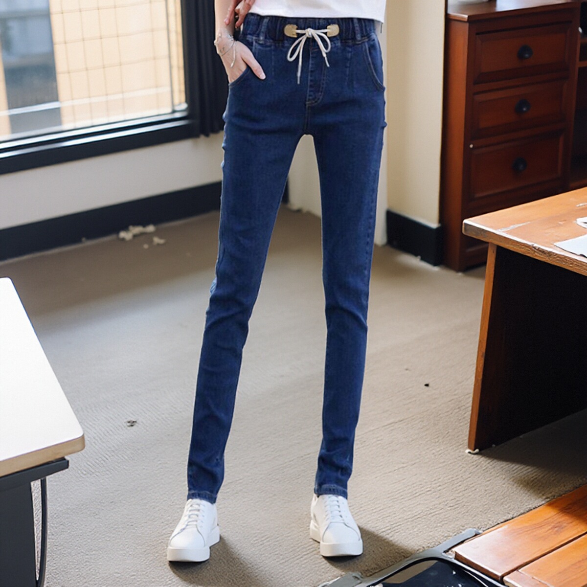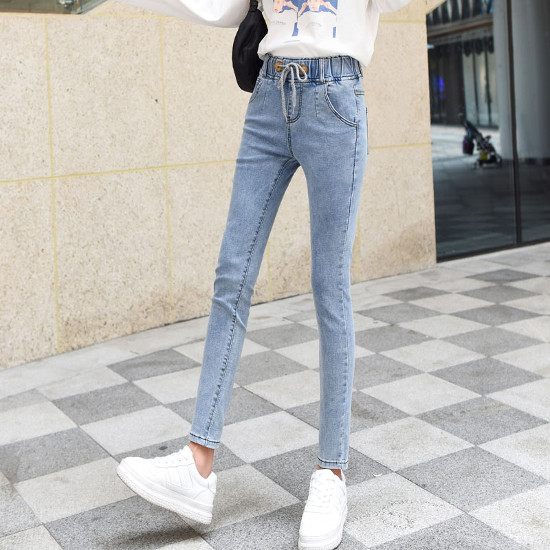 2025年新款高腰牛仔裤女哈伦裤弹力加绒深色修身休闲松紧腰直筒裤