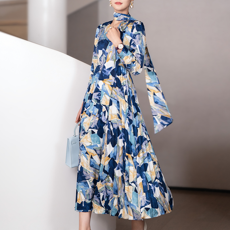 连衣裙女春秋2025新款时尚气质优雅端庄修身长袖缎面印花百褶裙