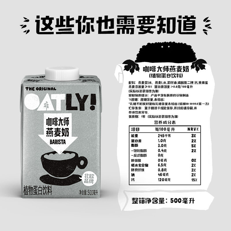 OATLY噢麦力咖啡大师燕麦奶500ml植物蛋白饮料咖啡伴侣拿铁0乳糖