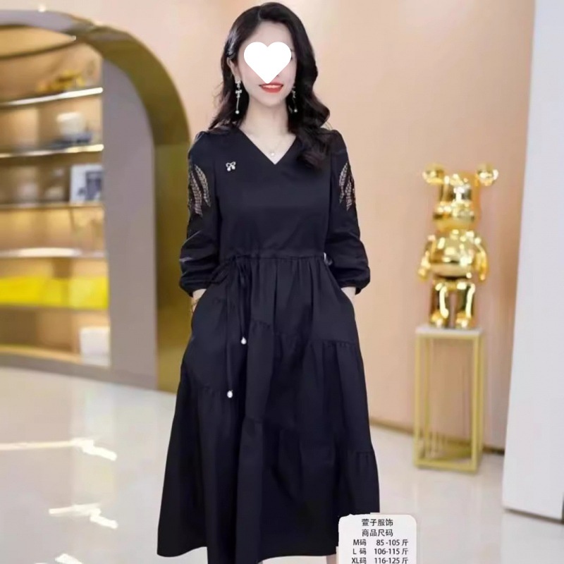 2024春夏季新款V领大码七分连衣裙气质镂空收腰百搭显瘦裙子休闲