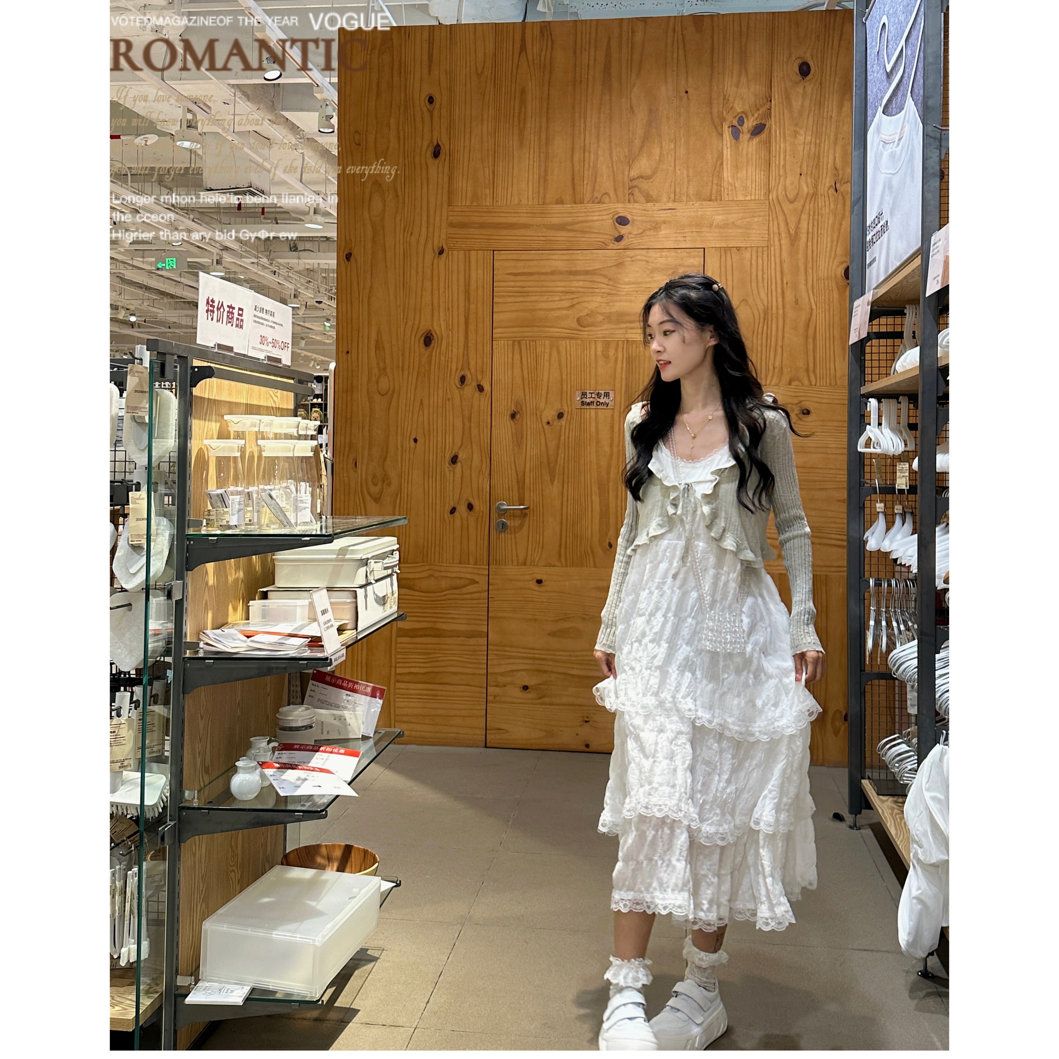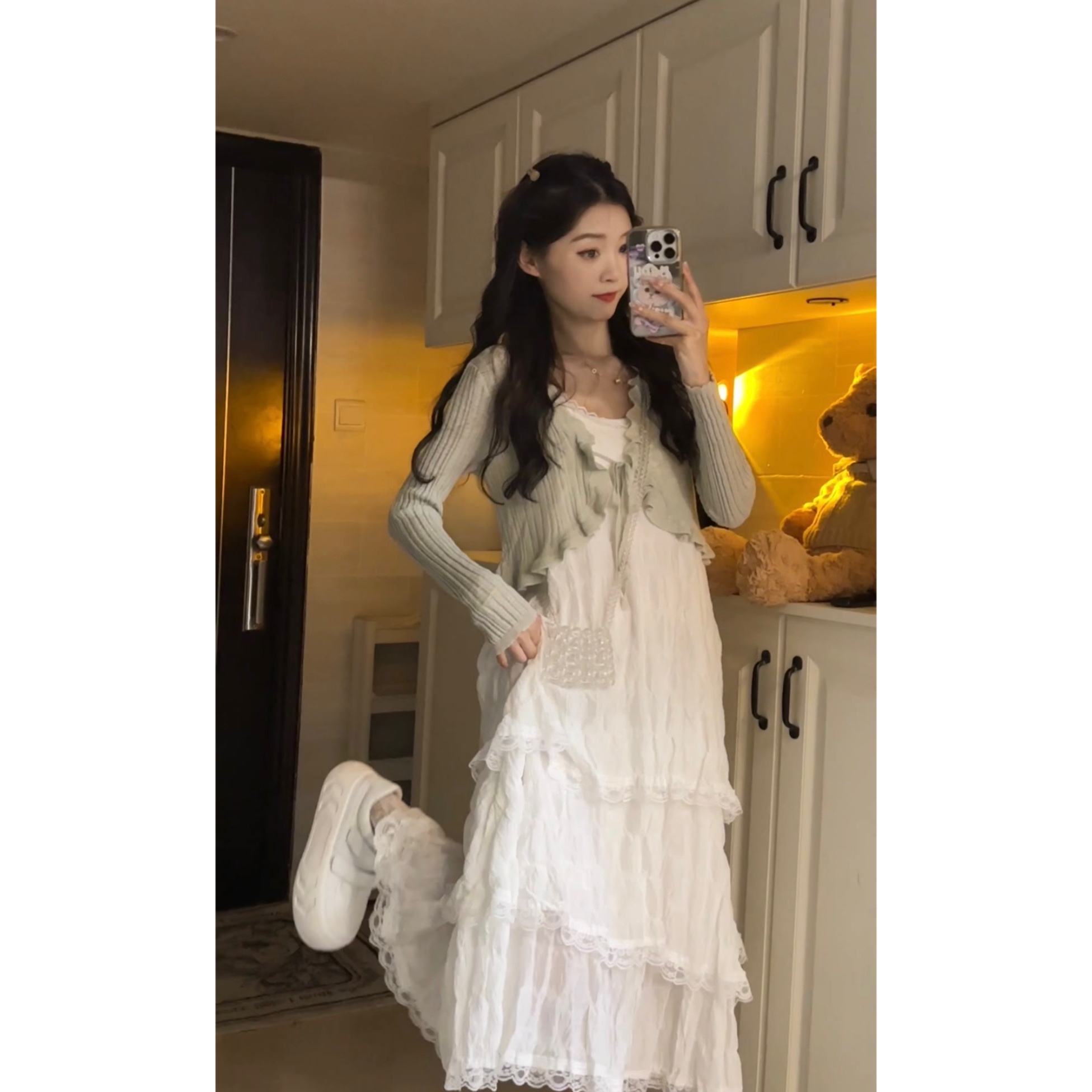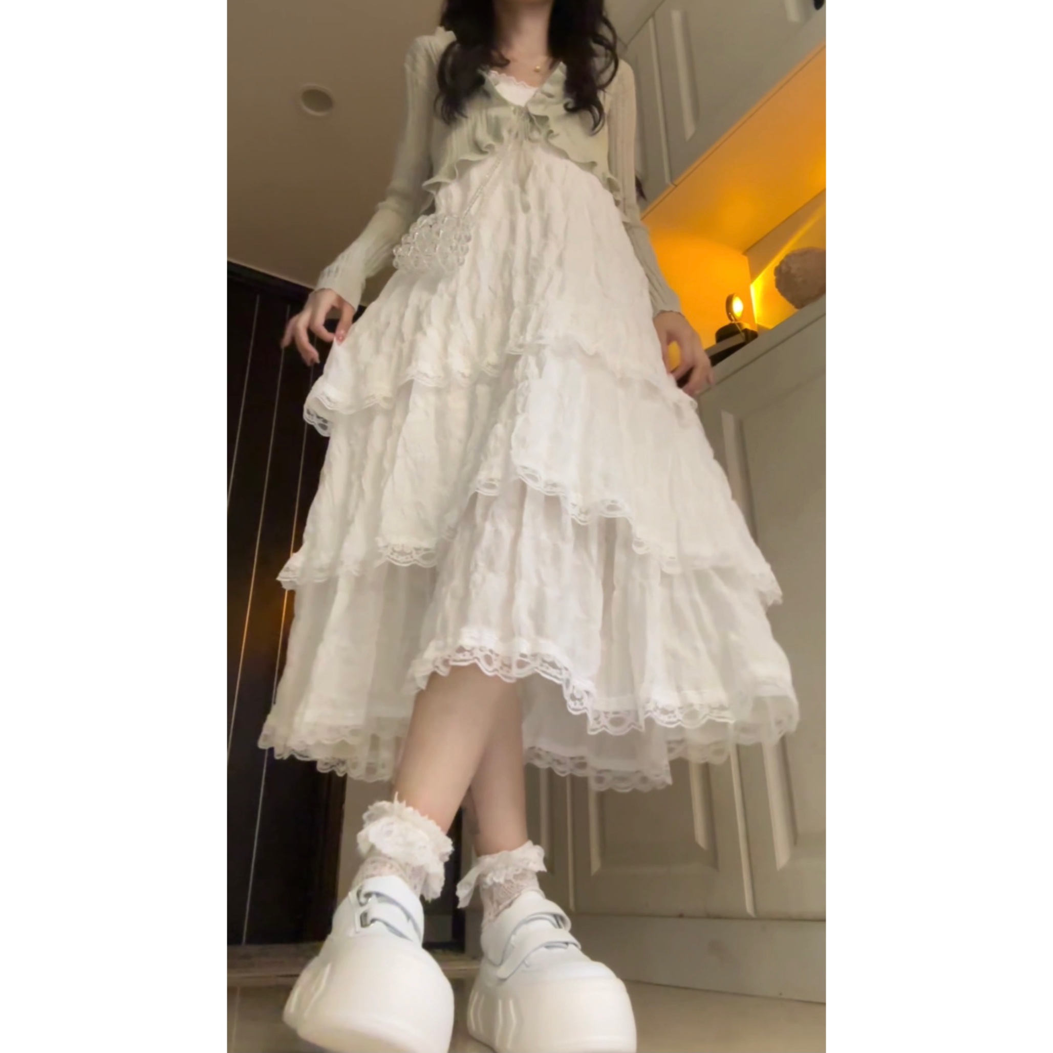 Seven 七分糖 女团 白色法式内搭吊带连衣裙套装收腰蛋糕长裙