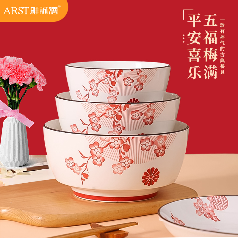 Arst雅诚德五福梅满家用釉下彩陶瓷新中式碗盘碟餐具套装可微波炉