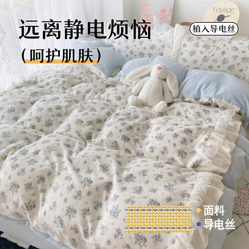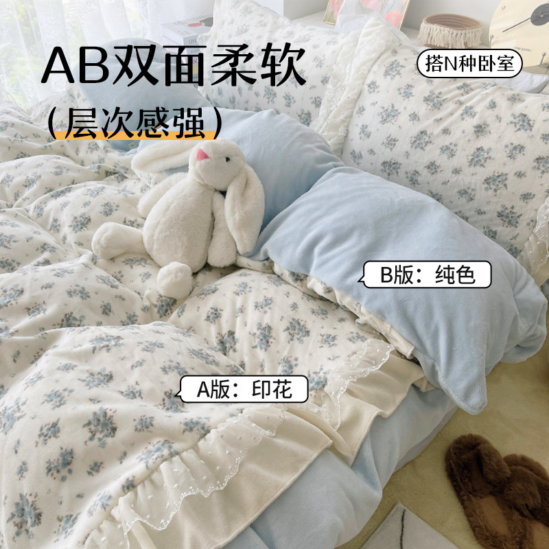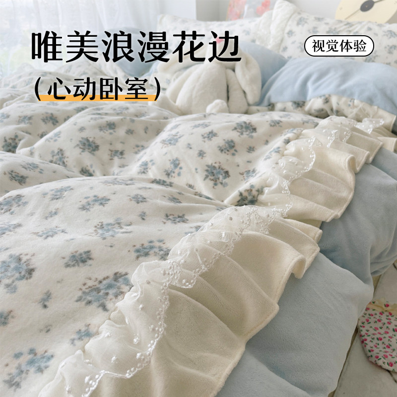 小清新牛奶绒床裙款四件套秋冬加厚花边被套床单珊瑚绒床上三件套
