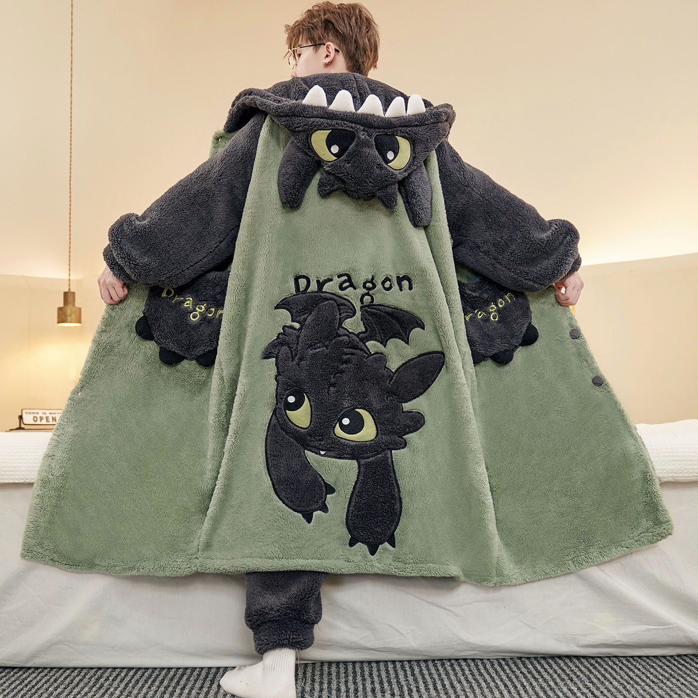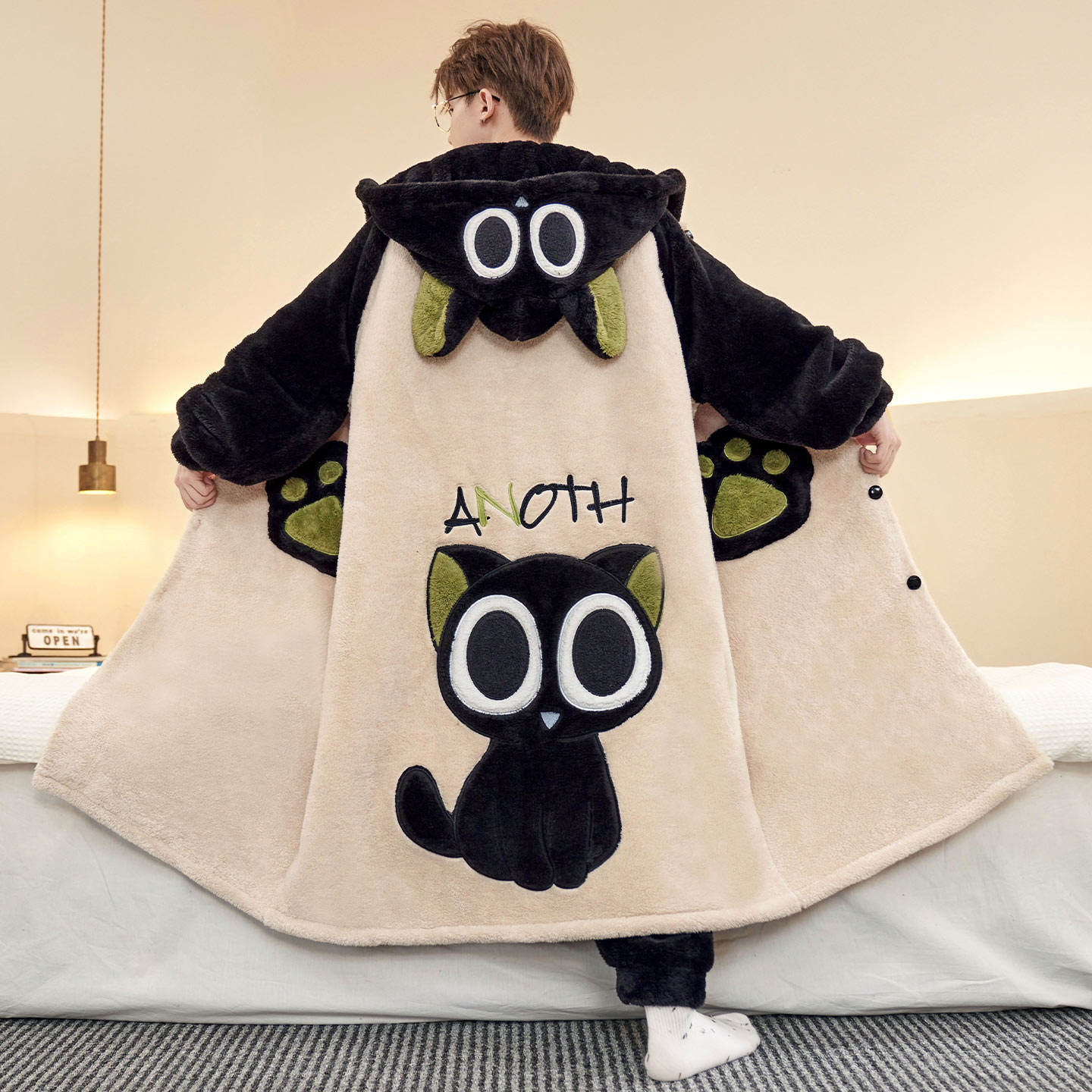耿鬼睡衣男款秋冬季珊瑚绒加厚加绒青少年连帽家居服睡袍套装外穿
