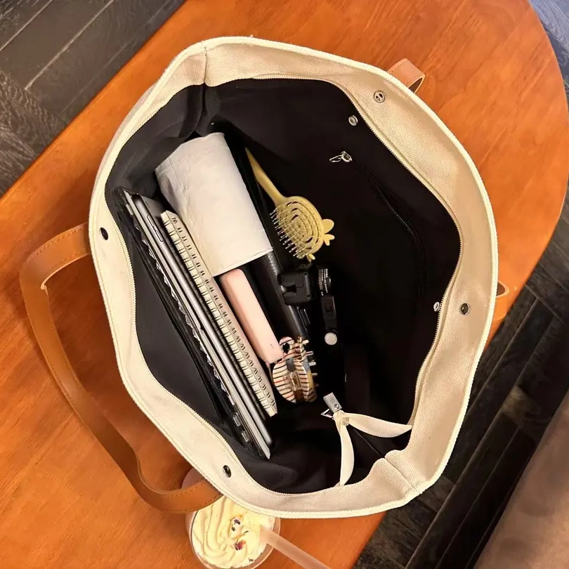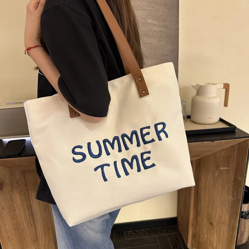 刺绣字母手提单肩帆布托特包女2025新款大容量通勤百搭大学生上课