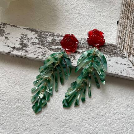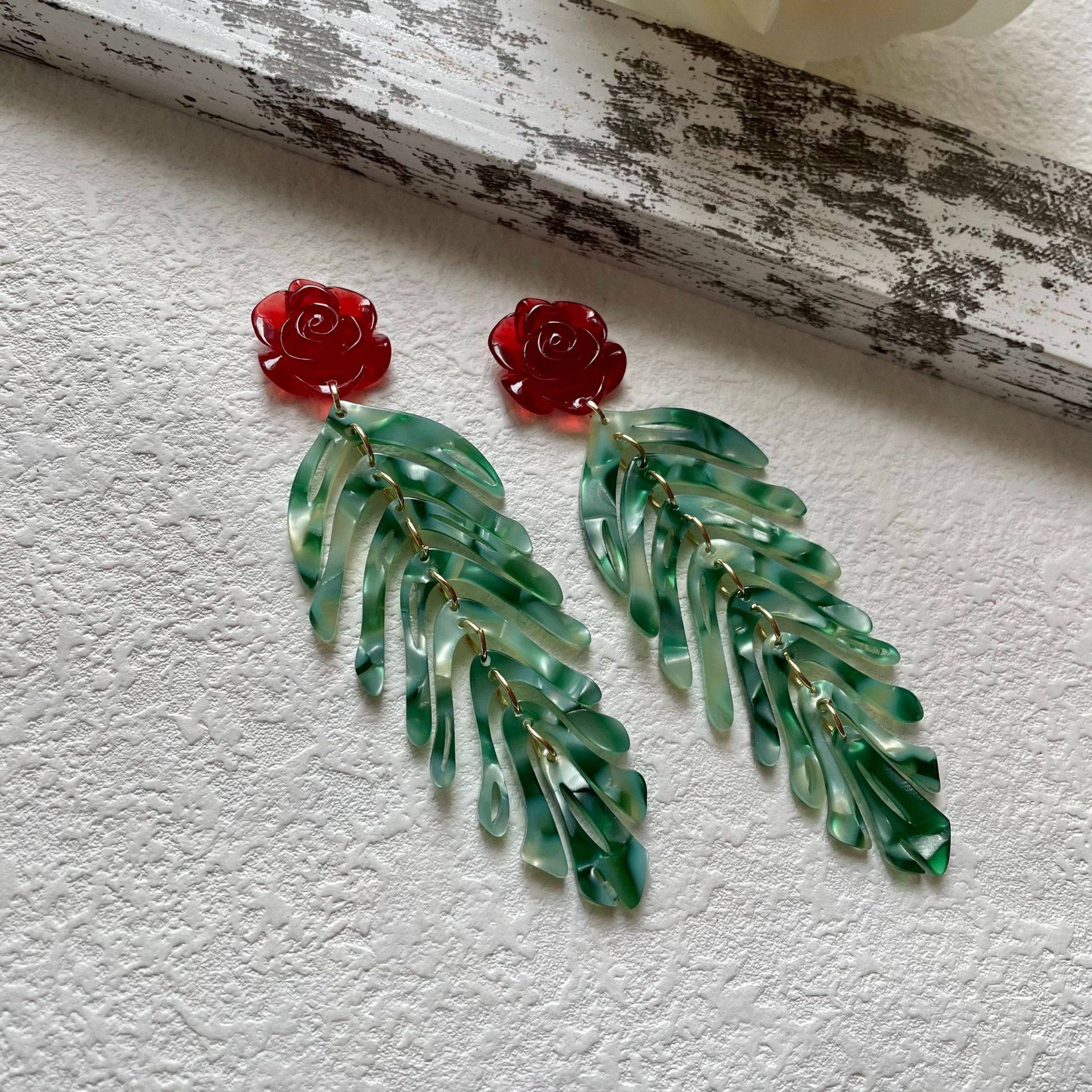 复古红色玫瑰花绿色叶子流苏耳环度假风酒红港风小花撞色长款耳夹