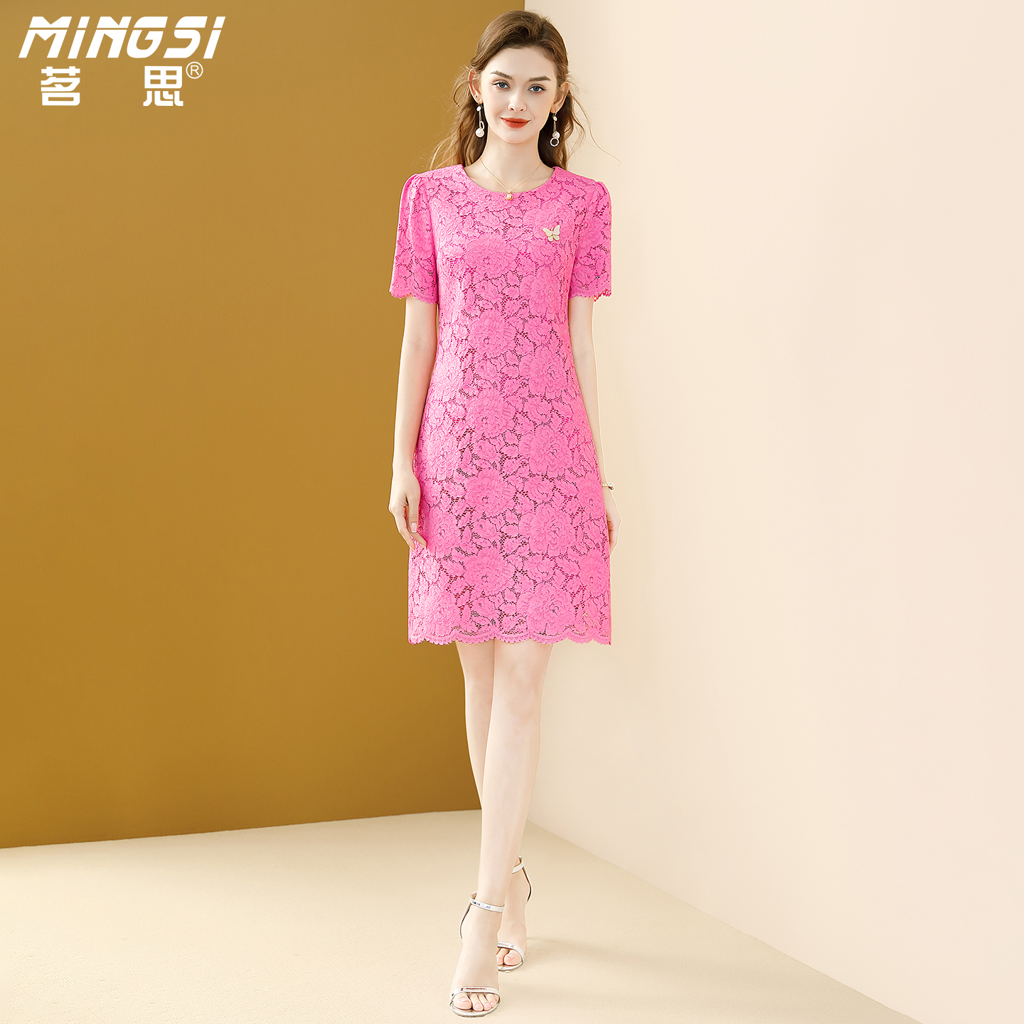 茗思气质女神范连衣裙2025夏季新款名媛蕾丝镂空短袖减龄显瘦裙子