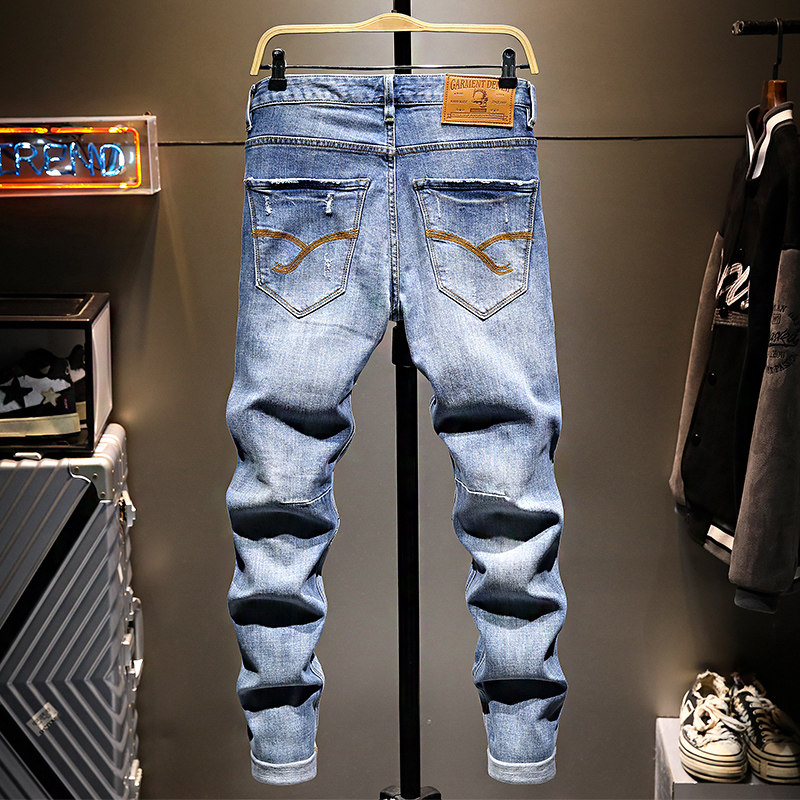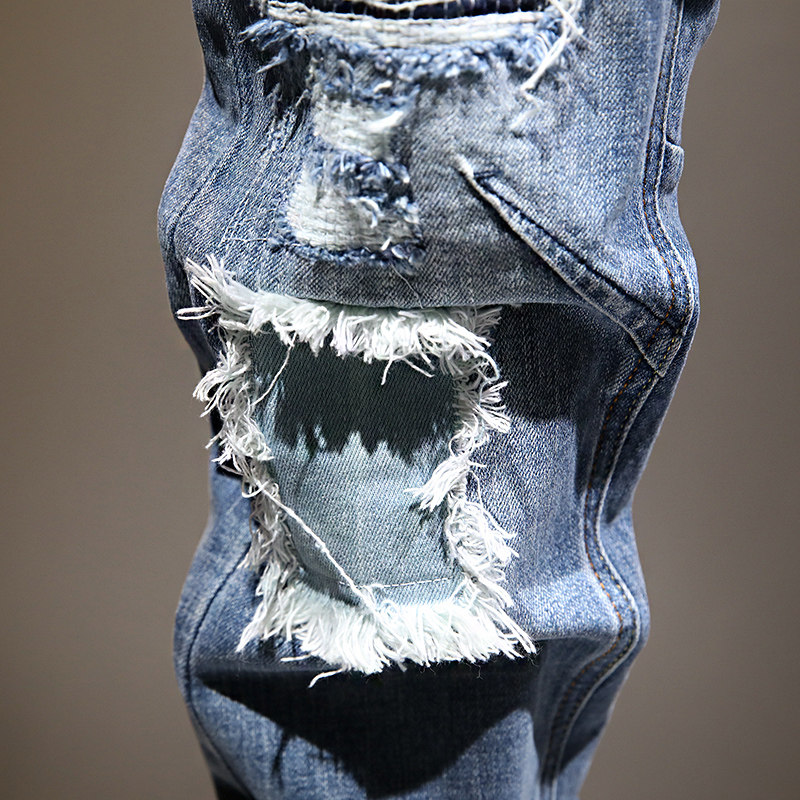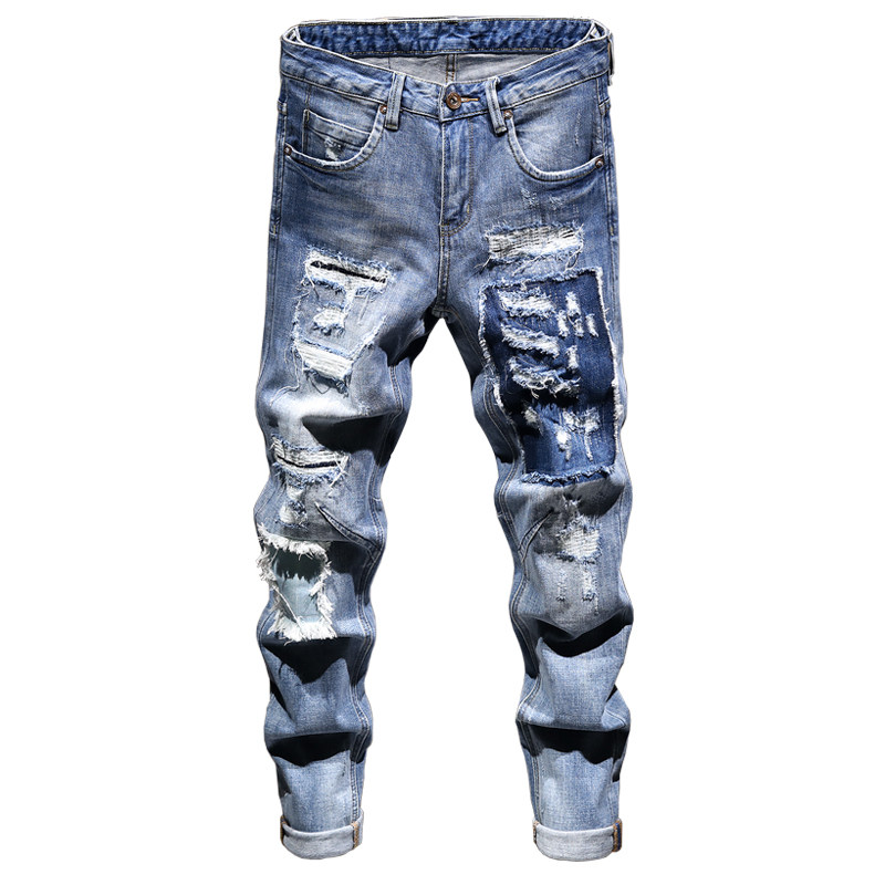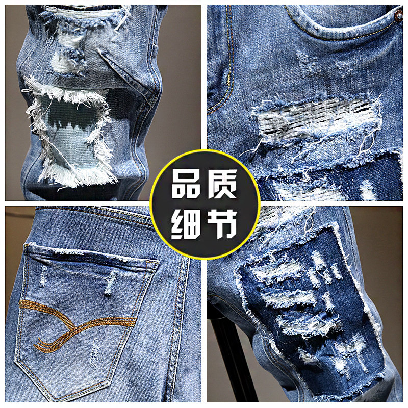 潮牌街头乞丐牛仔裤男士潮流韩版修身小脚裤时尚拼接毛边破洞韩版
