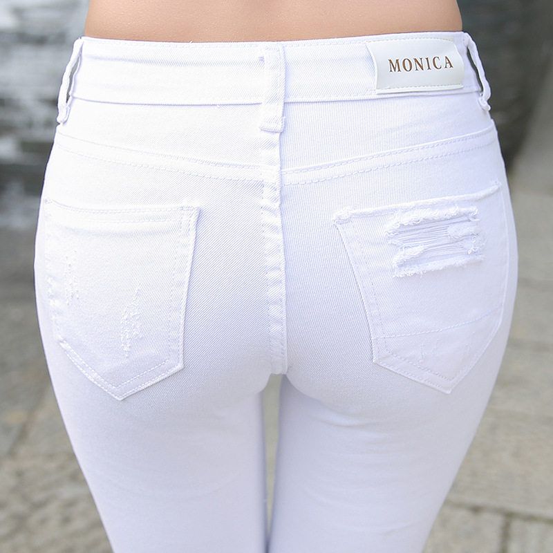 2025秋季白色破洞小脚牛仔裤女弹力修身显瘦牛仔铅笔裤九分裤批发