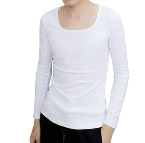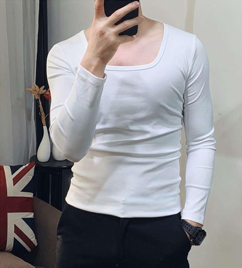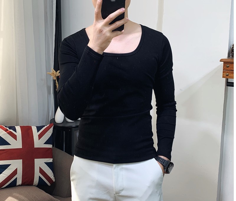秋冬季长袖打底衫男纯棉T恤大圆领社会小伙低领韩版修身方领上衣