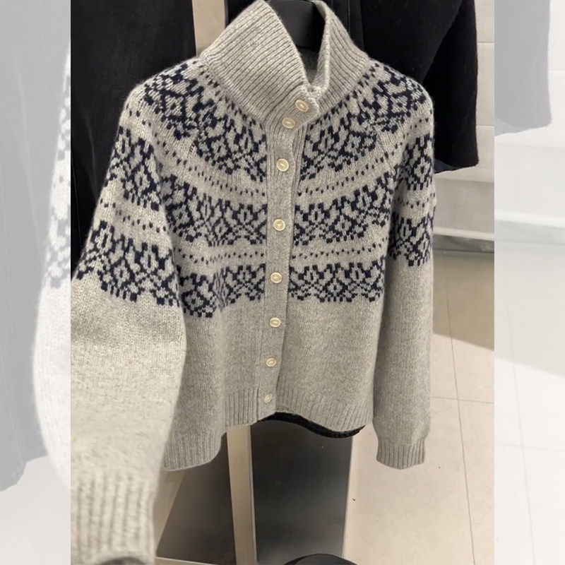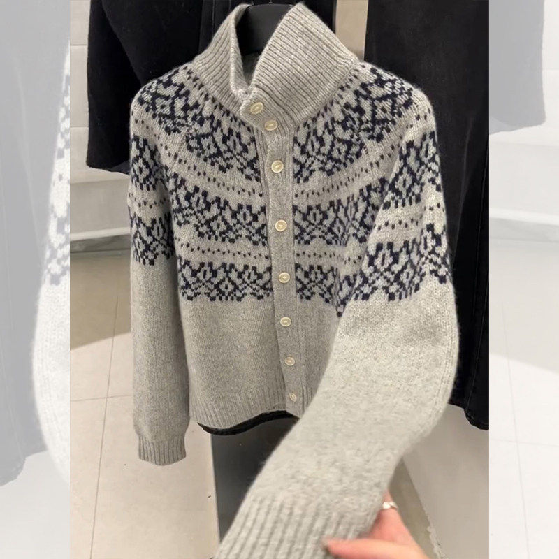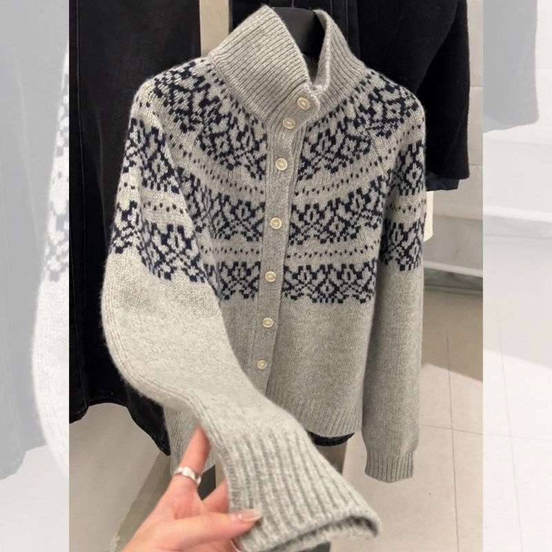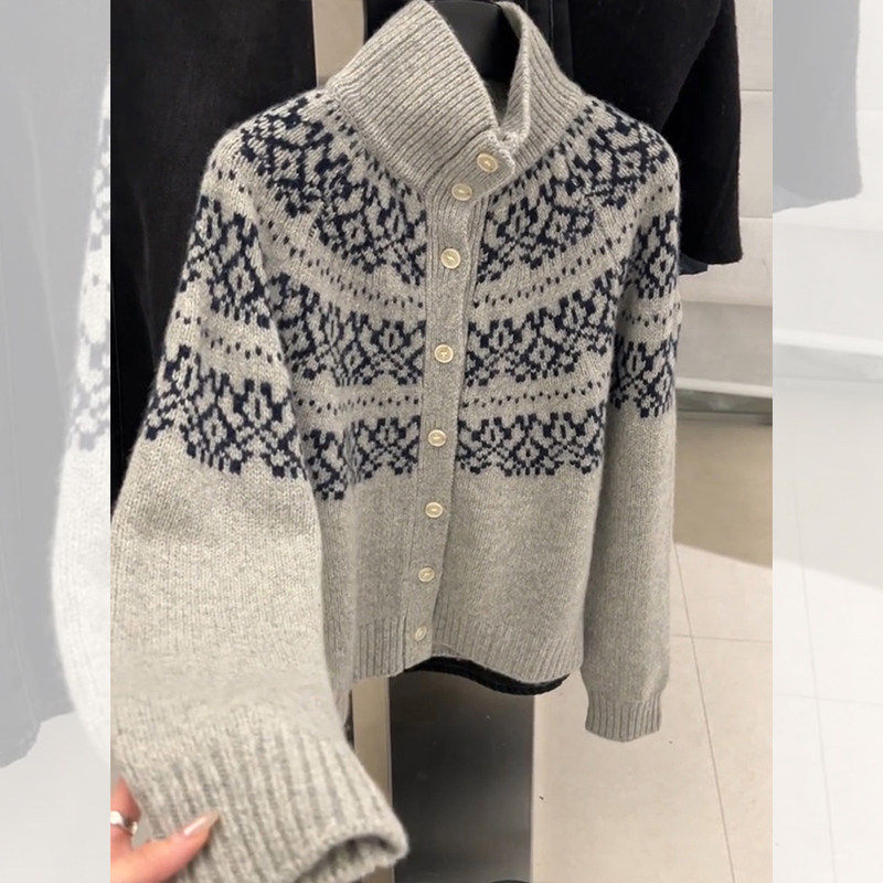 灰色半高领费尔岛毛衣外套女秋冬老钱风穿搭宽松立领针织开衫上衣